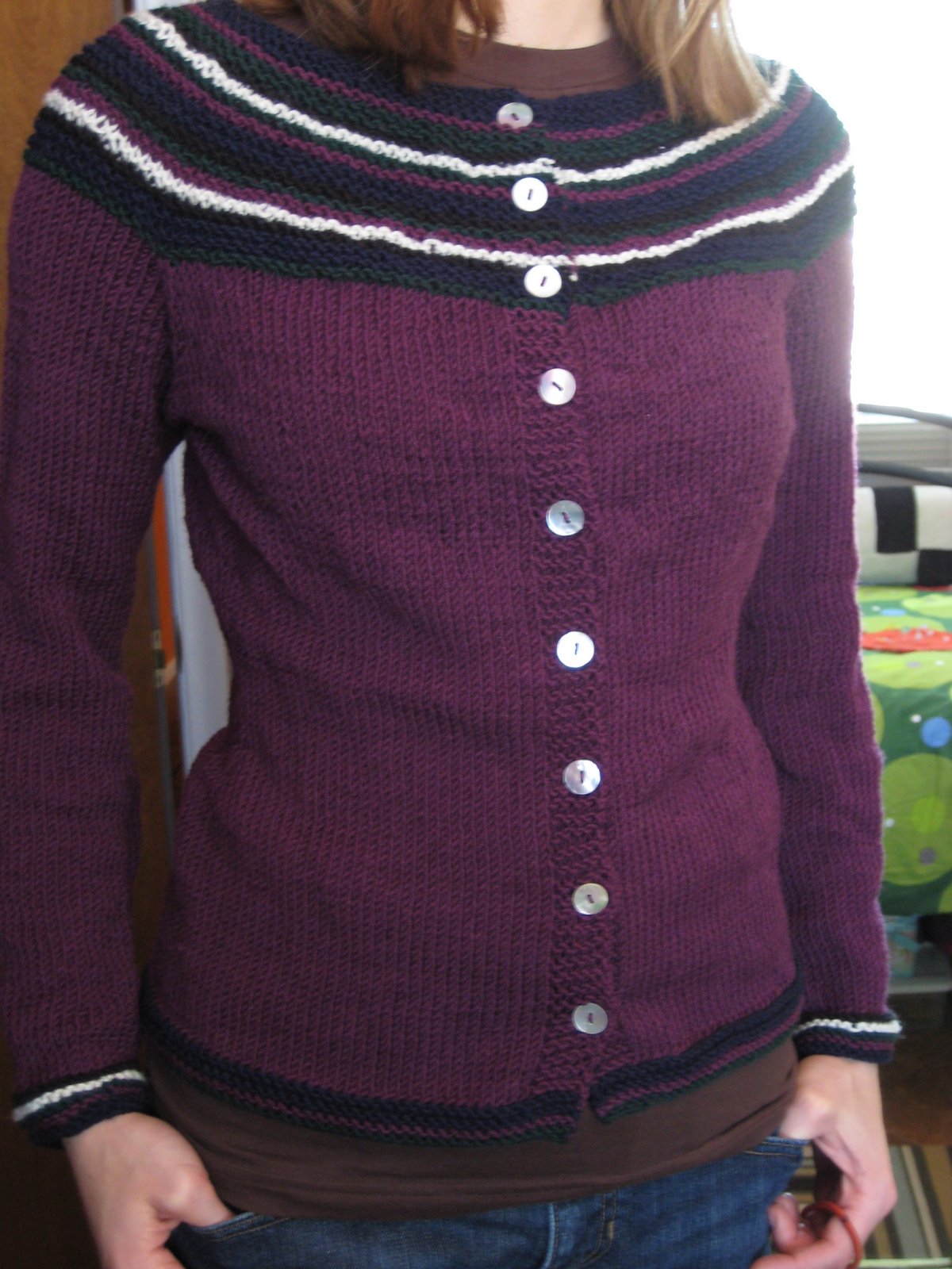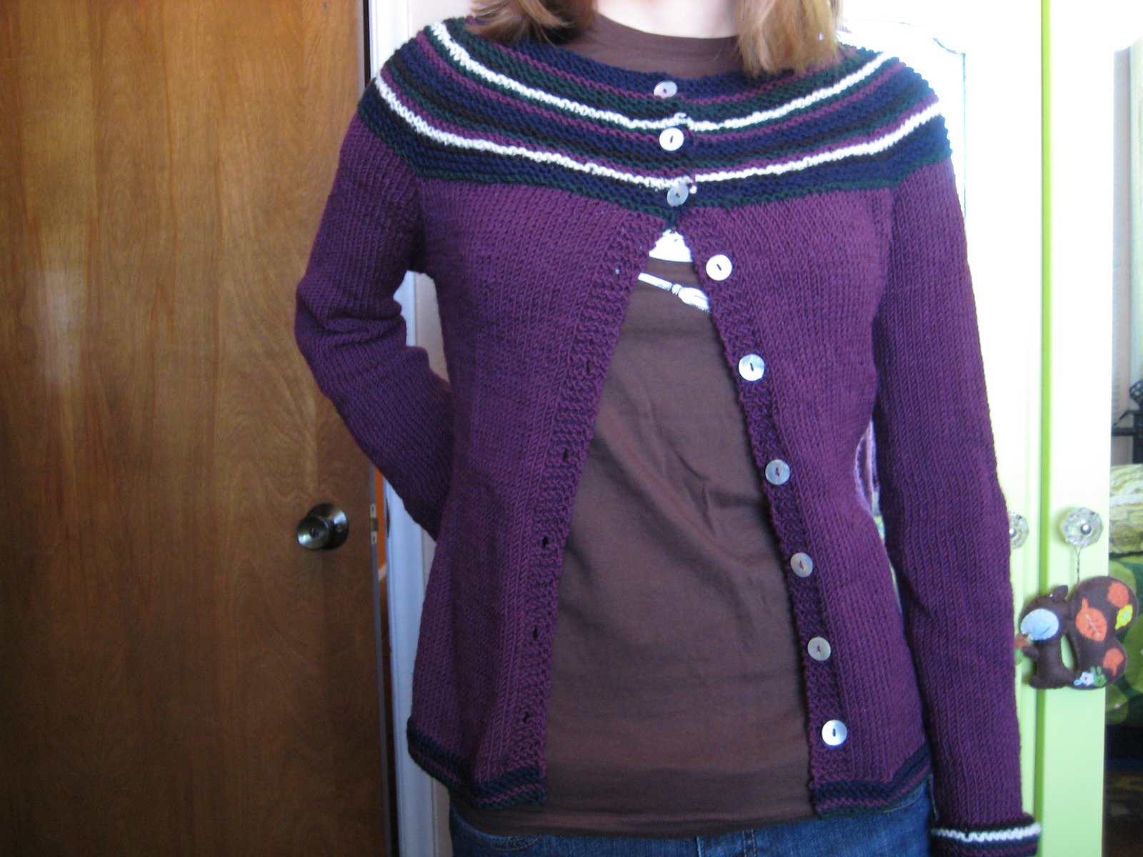 Modifications: Obviously, I added stripes in the garter stitch sections. This was partly to appease aforementioned Yarn Shop Owner, partly because I didn’t have enough purple to do the sweater in one color. As previously discussed, I knit the entire thing at a tighter gauge than recommended–19.5 sts/4″, as opposed to 18 sts/4″. Finally, I knit the sleeves 1/2 inch longer than the 15″ called for in the pattern, and added two more rows of garter stitch border at the end when that wasn’t enough.