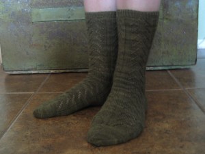 I really enjoyed knitting these socks. They took me forever because of the way I worked on it–pick it up, put it down, pick it up, rip out a mistake, put it down–but the pattern is not difficult to read or knit. Bush is brilliant, and all of her patterns are awesome, so the only modification I made was to work on 5 needles instead of 4–this gave me one pattern repeat per needle.
