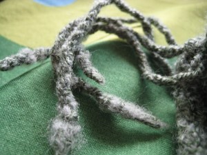 A little stiff, a little fuzzy. The color has faded a tad, too. Sniff, sniff. The sweater will hold up for a while to come (especially at the rate I can wear it), but I would not call the yarn’s performance stellar. This has been my experience with many sock yarns–even my favorite, Sockotta. Anyone out there know a really awesome sock yarn that holds up to wear and tear and still looks good enough to knit a whole sweater out of?