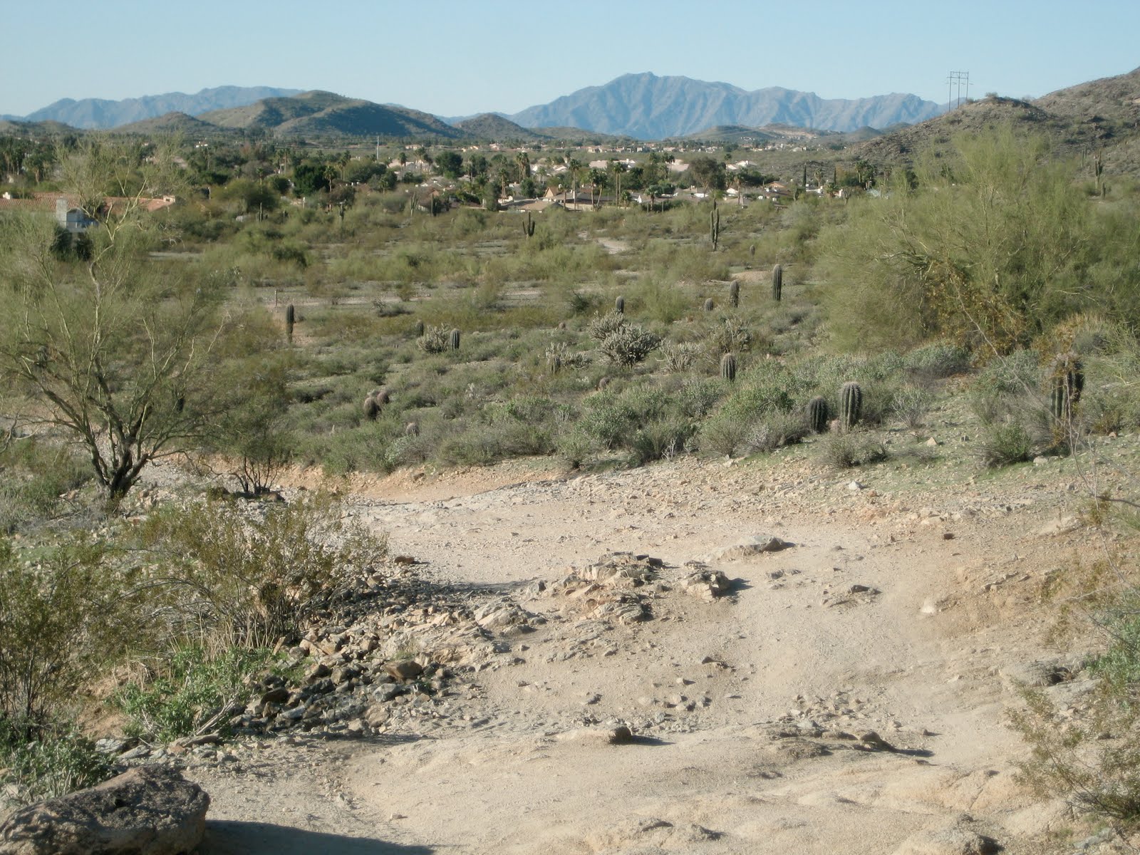As promised, here is a photo of the mountain turning green. The bottommost layer is a fine fuzz of green grasses and wildflowers. Above that, the brush–bursage, brittle bush, and creosote–are all coming out with their leaves, filling in the space around the perennial spots of green, the cacti.