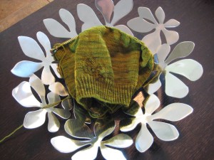 And knitting–can’t forget the knitting. I retrieved the Lace Leaf Pullover from my knitting basket on Saturday when I ran out of yarn on my commissioned project (remind me to reveal that), and I’m already past the little leaf motif (which I am quite taken with) and on to the rounds of plain stockinette for the body. When you’ve got a mountain of discussion posts to read, it’s nice to have something simple in your hands. If I had the time to watch my knitting, the yarn (Twisted Sisters Jazz) would be entertainment in and of itself. It’s been a while since I’ve worked with a handpainted yarn, and it’s fun to watch the color variations come into the fabric and layer atop the shades from the previous round.