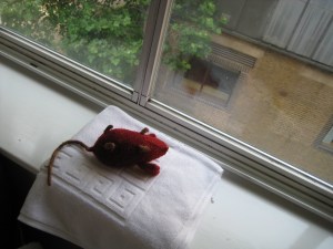 I nearly added Mousie to the load while doing laundry in a rush–luckily, I spotted her as I was adding detergent and a little rinsing in the sink and drying under the window put her to rights. Had I not gotten her out, it would have been disastrous on two counts–Mousie is not at all superwash, and the load in question was my whites.