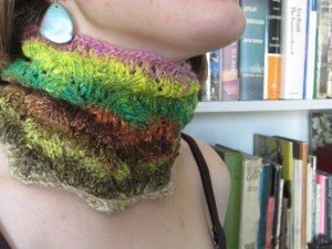 The neon yellow and lime green in this colorway had worried me a little bit when I started knitting, but the pinks and browns balance that out nicely. I used exactly half the skein, so I’m tempted to use the other half (which has a great bubblegum pink and carnation red along with a shell gray) for another crofter’s cowl, just to see how the colors come out.