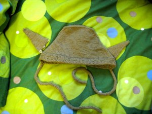 Notes–the Yoda bonnet is knitted with the discontinued Silk Road Aran, which is a little too hefty. The Totoro version, knit with Debbie Bliss Cashmerino DK, has more give, which is ideal for a bonnet that stretches to fit snugly around the wearer’s head. Having worked the back of neck decreases as written for the Yoda bonnet and been unhappy with the fit, I adjusted the rate of decreases for the Totoro Bonnet for a gentler slope. Full list of mods Ravelled here.