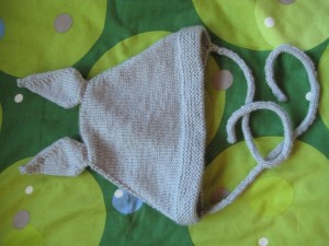 The pattern, as you may have guessed, is HelloYarn’s Top-Down Bonnet with Anime Character, aka the Totoro bonnet. I had downloaded this pattern ages ago, but put off making it because I was intimidated by the figure 8 cast on. I shouldn’t have worried–Adrian put together a tutorial for that, and I can attest that it comes out ok even if you forget to untwist the stitches on the second needle.