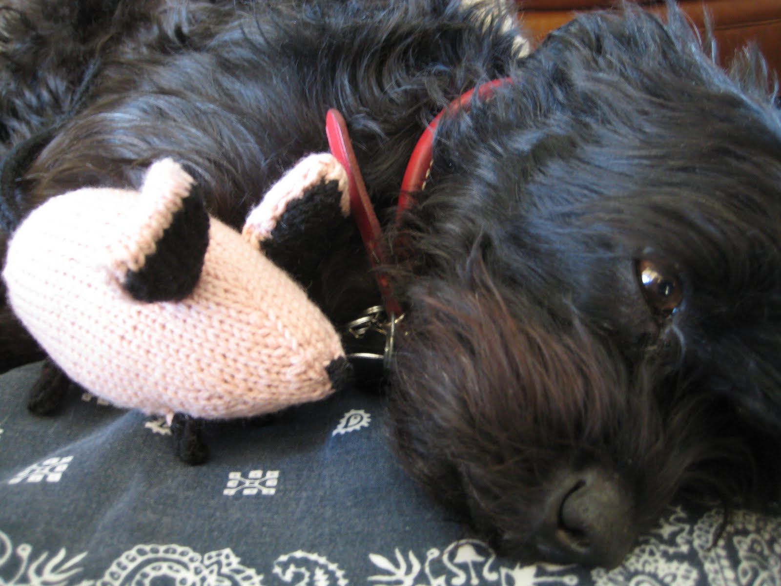 Already off the needles is a Mousie (modeled with Stella, who was too simply exhausted to protest). This is my fourth Mousie to date (the most famous being my own international traveler Mousie), and I can’t say enough about the pattern. Ysolda is known for her all-in-one knits, and she extends this philosophy to her toys as well as sweaters. Mousie’s turnip-y body extends right out of the tail, and then the feet are knitted right on to the body (which makes for some stares if you do that part on the bus), ditto the ears, and by the time you’re that far, the whole little thing is so cute, even I am not put off by having to seam up the sides of the ears.