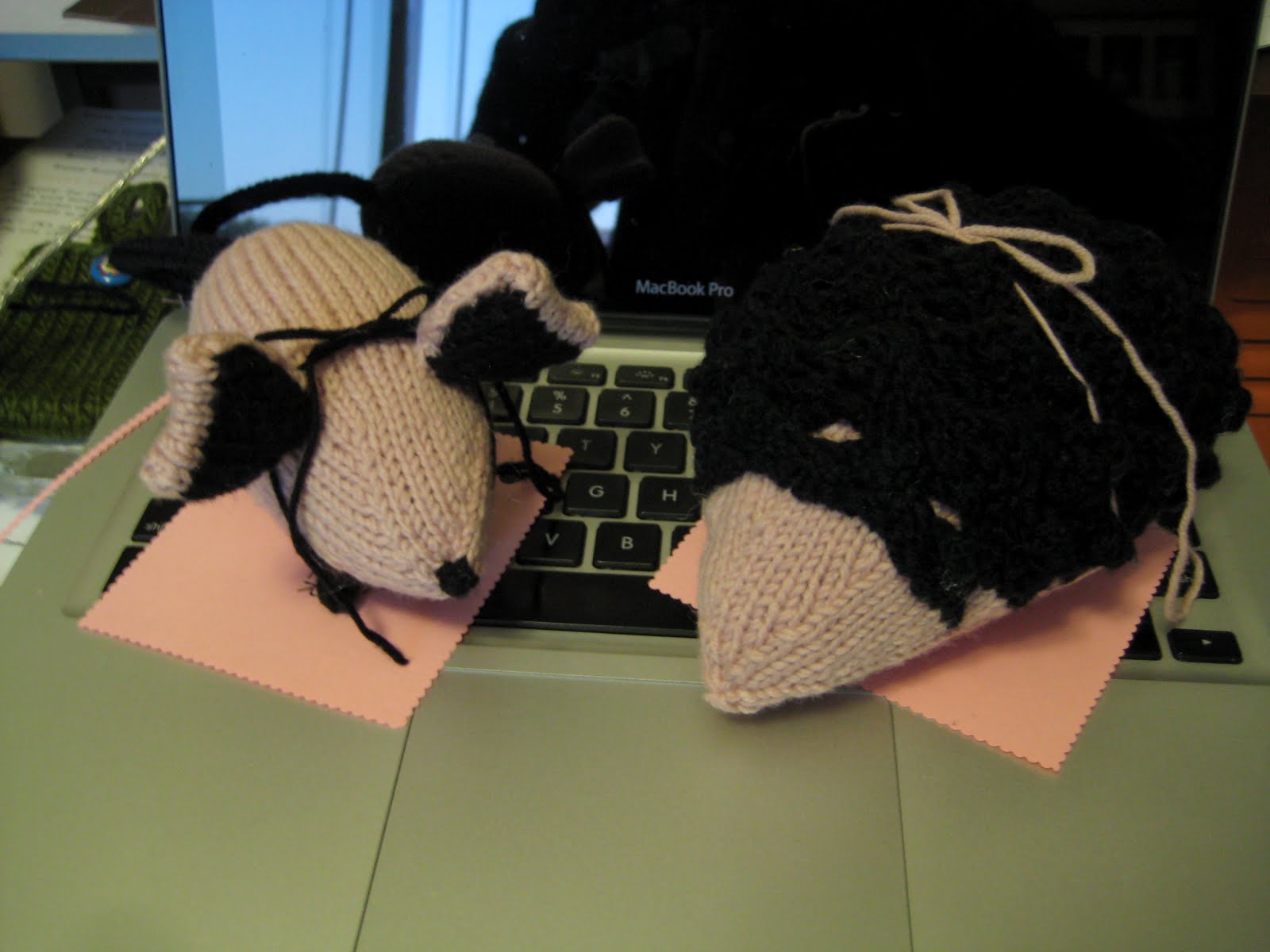 Hedgie is the baby’s (no tail to swallow, but lots and lots of nubby spikes to gnaw on), while Pinky will go to the Big Sister (who I think–hope–is past the toy-eating stage) to help keep the peace. Both are knit out of superwash wool from my stash and stuffed with polyfill. My inner eco-freak squirms a little at the thought of the synthetic fiberfill, but one cannot deny that little baby toys will need to be washed at some point in time. If you’d like more details, Tulip is Raveled here and Pinky is Raveled here.