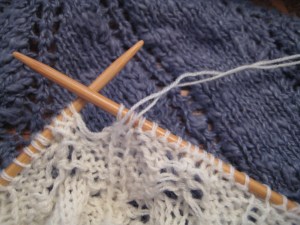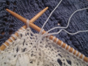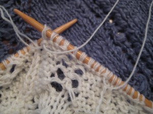 * Like casting on, binding off, and holding one’s yarn, this is one of those things that everybody does differently. For lace in particular, where the fabric is delicate and you don’t want any nasty lumpy areas, there are enough different techniques for rejoining yarn to fill an encyclopœdia. This shawl is for me, however, and I am entirely out of patience with it, so I rejoined the yarn the way I always rejoin yarn, which a statistically significant portion of the knitting population will undoubtedly feel is wrong on so many levels. All of them can go read Knitting without Tears and see what EZ has to say about “right ways” of knitting.