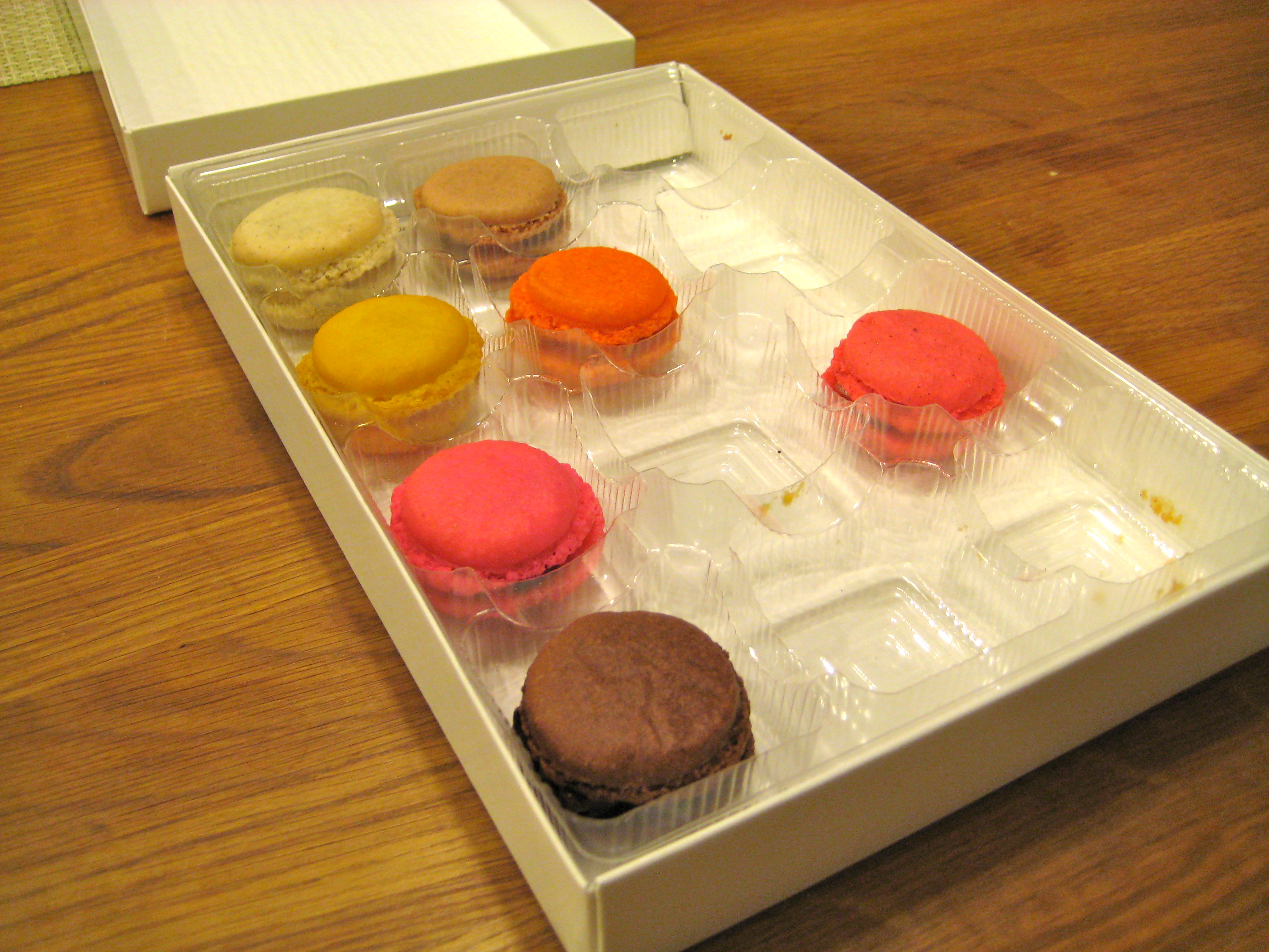 When eating at Essence, I have always gotten the full-sized macarons, which are just the right size to savor with a cup of coffee. The little ones, however, are more like chocolates–so bright and appealing in their box, little enough that if one doesn’t satisfy, you can try another. I don’t know if I can claim a favorite…the caramel cream is good, so is the espresso, and French chocolate, and, as I discovered, the orange. As you can see, they go as quickly as a box of chocolates, too.