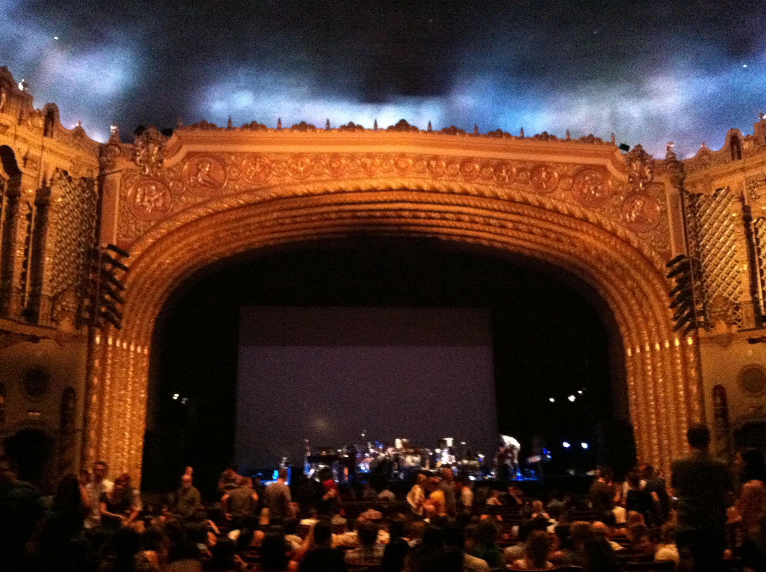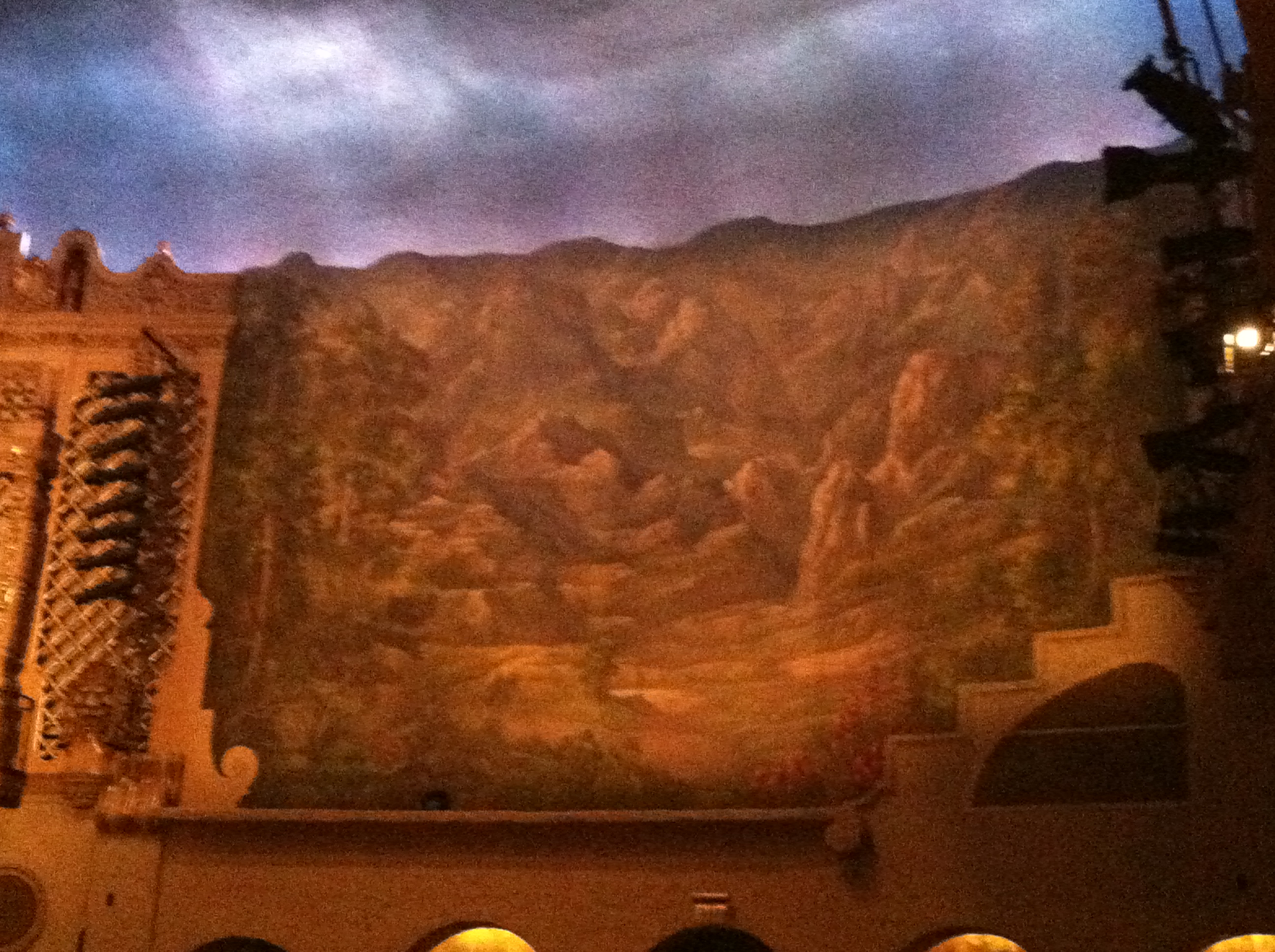 The quality of the intermission is generally determined by the venue. Intermissions at the Marquee are interminable, and spent alternately keeping an eye out for latecomers who have had enough to drink to think it’s a good idea to take spots from those who came early and studying the ravaged guts of what was once a proper theater, with seats, curtains—the whole nine yards. Intermissions at the Crescent Ballroom are a little better, and you can generally divide your time between watching the roadies set up and people watching. The Orpheum has assigned seats, so we were free to stand up, wander a bit, and admire what remains a lovely old theater. Its builders combined deference to the classical ideal—a thick, gilded proscenium arch, bas-relief cameos above the stage, red velvet seats—with murals of idealized Western landscapes on the walls.