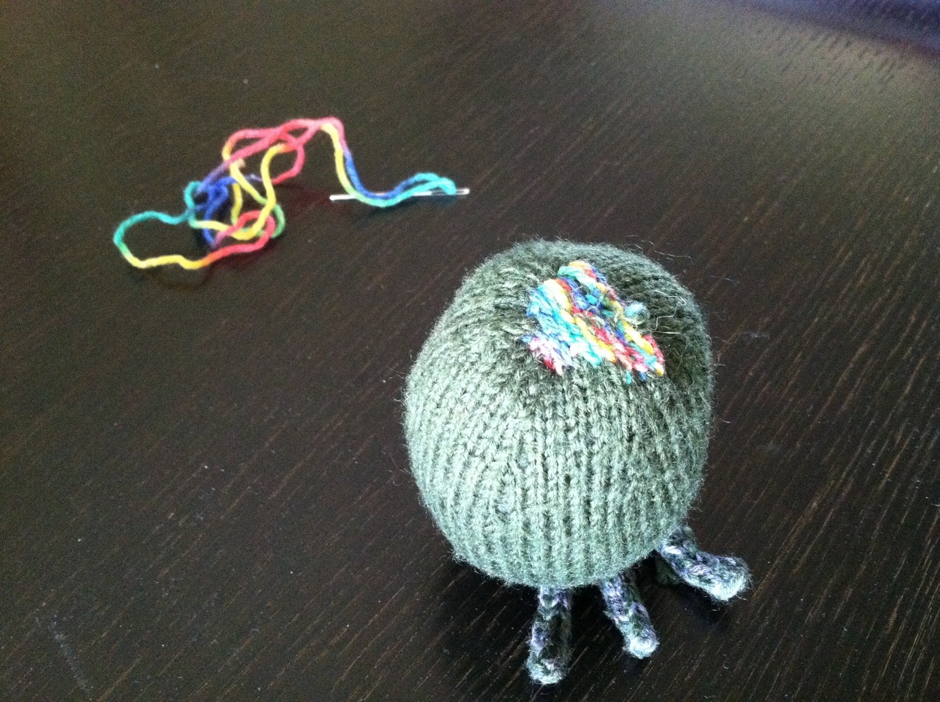 With the help of a little darning in acrylic yarn, one of Stella’s favorite toys is back in commission.
