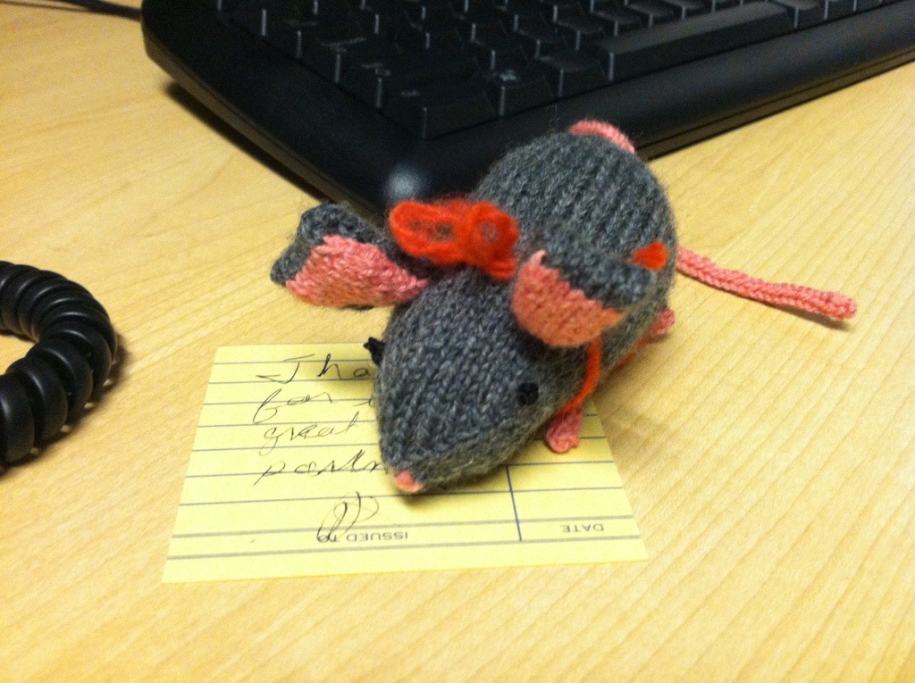 Today, the semester ends and we all take a long break. The mouse, completed with the help of loud music, is for my lovely office-mate, who never complained once about being interrupted with my random questions, or my messiness, or my ever-expanding pinecone collection.