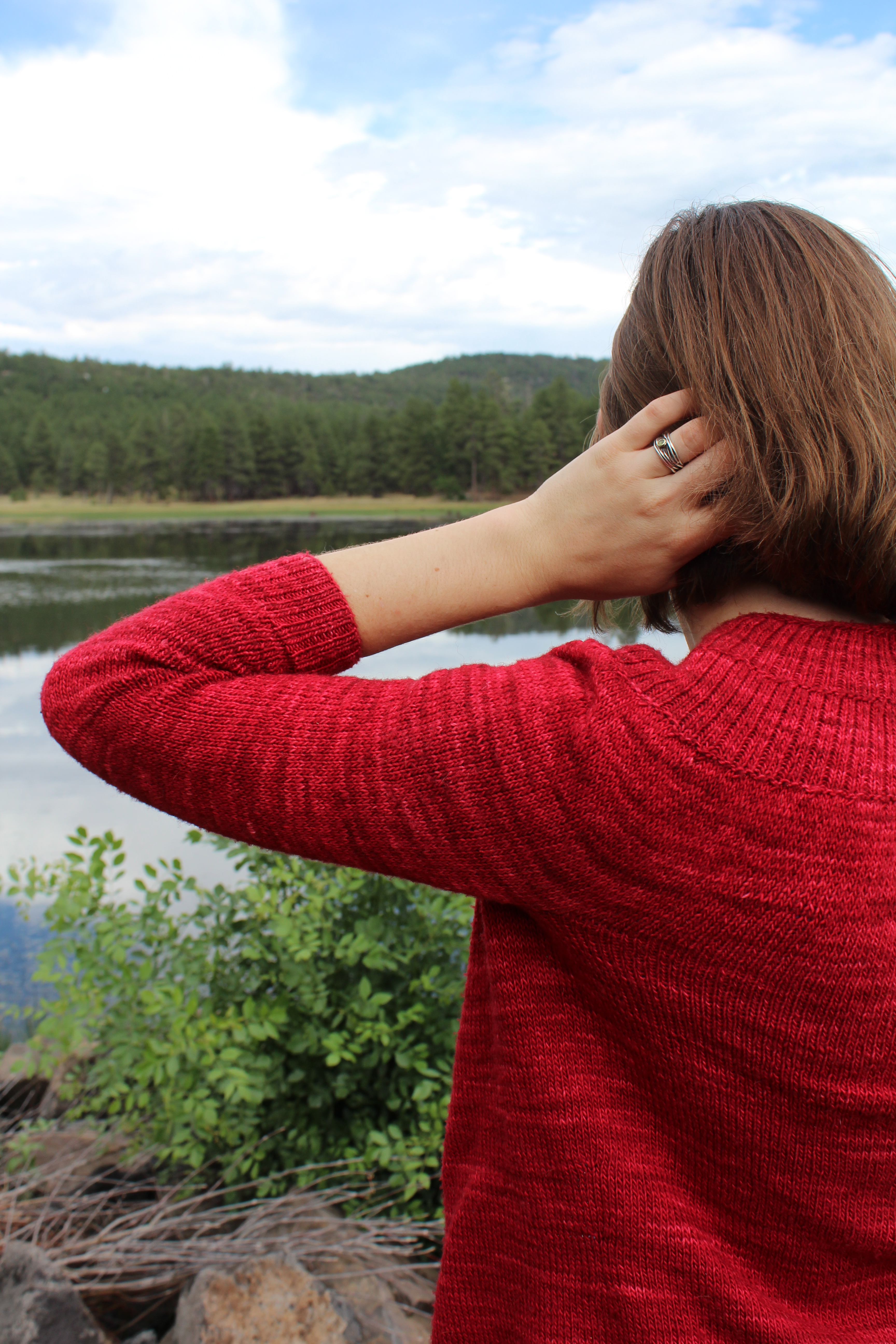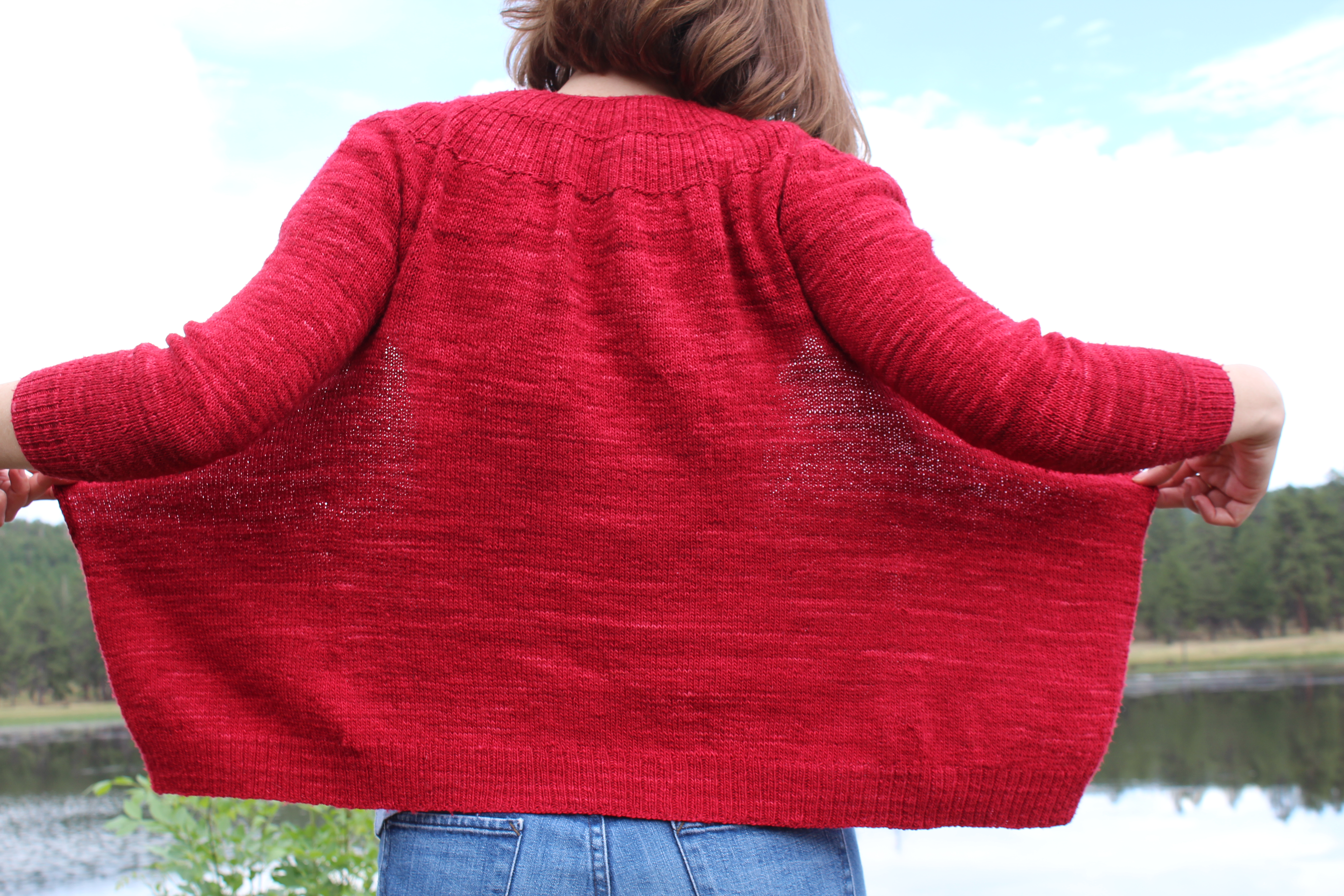Where have I been? Not on the blog very often. But I promised you a FO post a while back, and here it is! The FO is my iteration of Leah’s Lovely Cardigan from More Last-Minute Knitted Gifts. It is emphatically not sweater weather in Phoenix, so pictures had to wait until we were up north (Querido took all these photos. Isn’t he nice?)