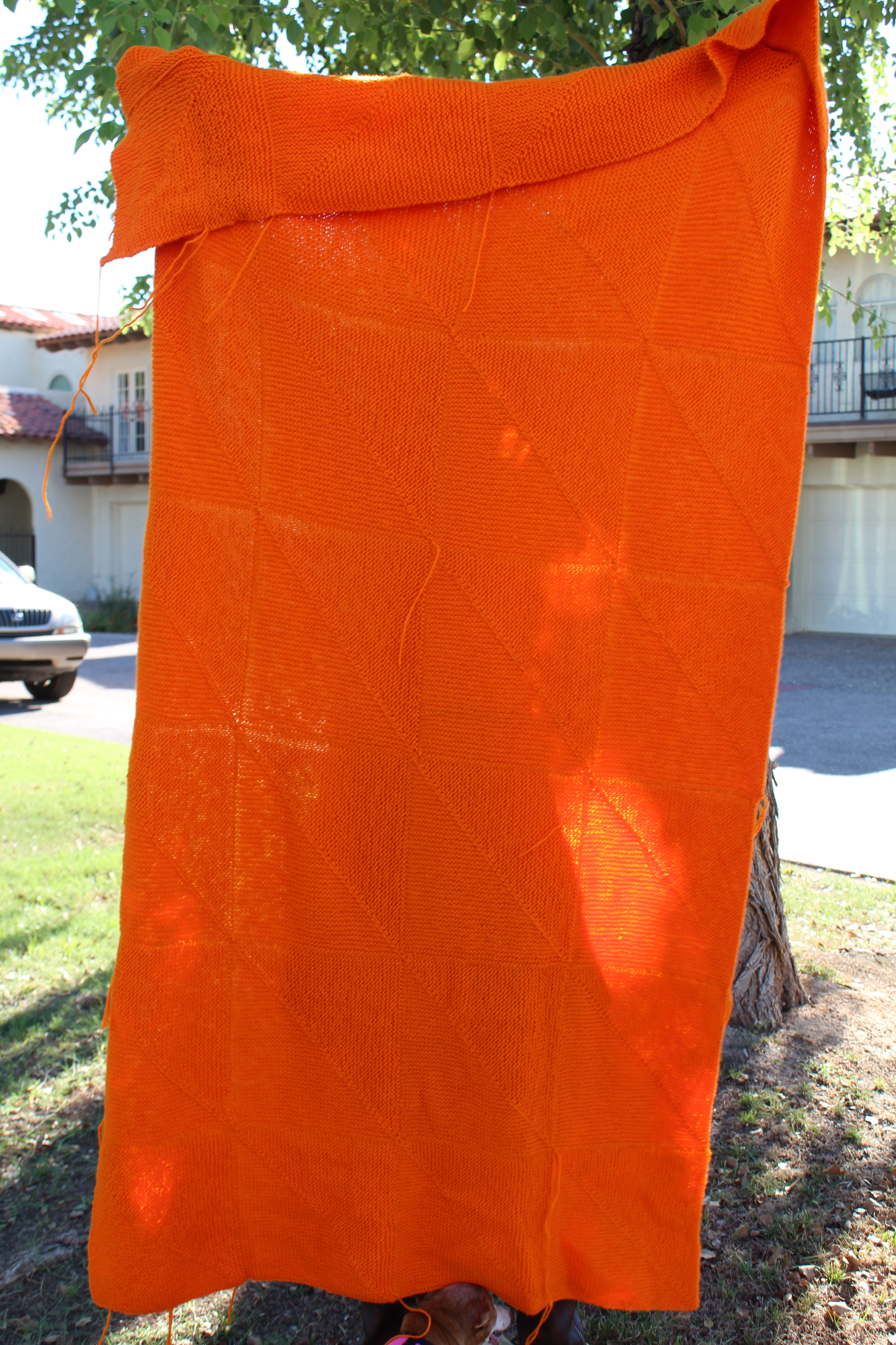 I felt like I became more visible while knitting my Ground Cover blanket, too. It was hard not to be: I knitted mostly on public transportation. When you’re knitting on public transit, people tend to ask questions. When you’re knitting something huge and bright orange on public transit, they almost always ask questions. Top of the list, as always: “Is that knitting or crocheting?” Shortly thereafter: “What are you making?” For once, I did not mess with their expectations of what crafters do by informing them I was knitting a nautilus or a romper. Blanket fits very well within Crafting Stereotypes. Lucky for those instances when People Who Do Not Appear Trustworthy wanted to chat, saying “blanket” and looking like it took lots and lots of concentration to knit my bazillionth row of garter put the kibosh on Further Conversations With Potential Victim. I am happy to report, though, that many people seemed to want to know if I was knitting, or what I was making, so they could tell me about their mothers or grandmothers, and how these women would make blankets and sweaters. Always women, always nameless, always making expected things, but my fellow public transportees seemed happy that they had the occasion to remember their relatives, and the handmade things they’d received.