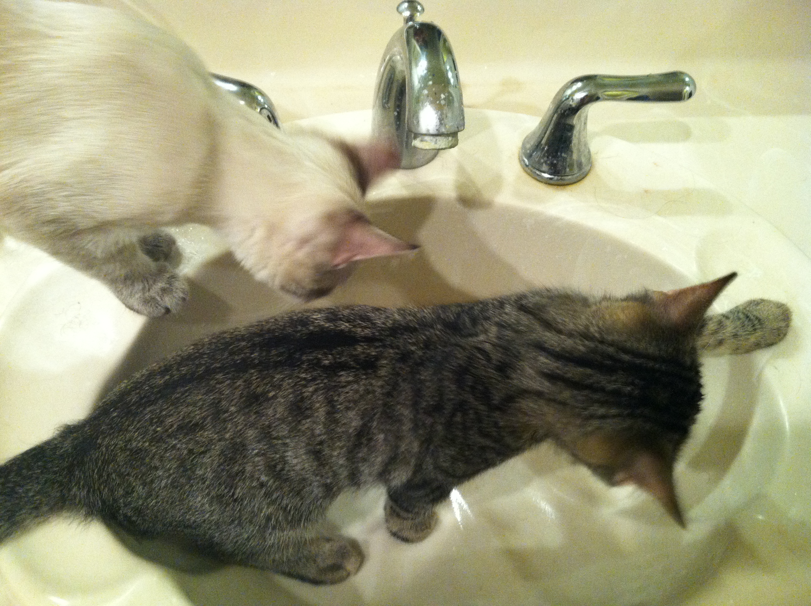 Perhaps as a result of spending the first two months of their lives either in a bath or drying after a bath, the kittens now love to play in water. Sinks and showers are great fun, but when one is a kitten, everything is a toy. Toys are EXCITING, because everything a kitten thinks is thought in caps, and PLAYTIME is attempting to eat or otherwise destroy THE BEST TOY EVER.