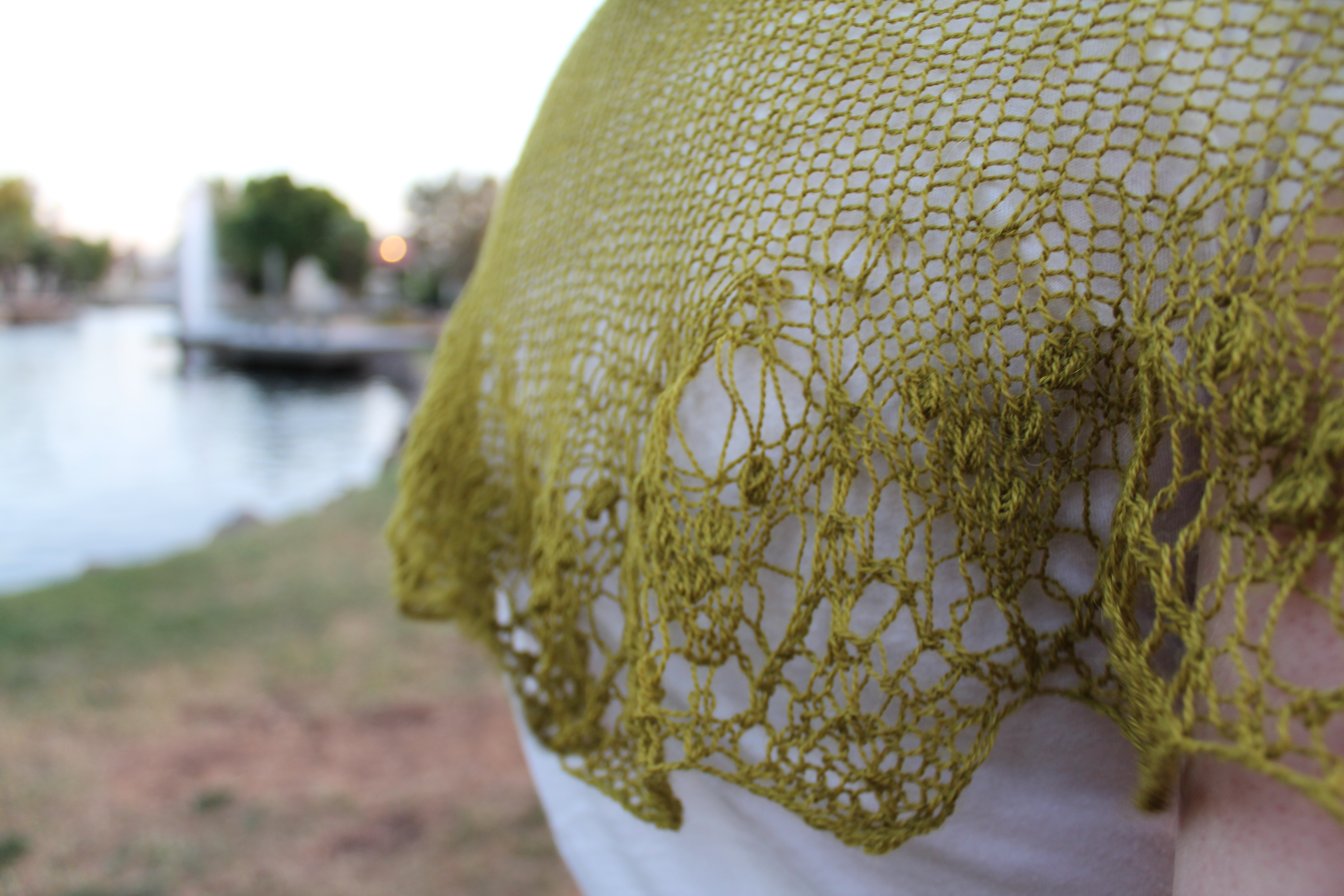 And then the blocking. I’ve blocked before, and have blocked shawls before. I followed the directions, pinning the edges into place and then moving inward, but it was beastly. The fabric is very loose, and shifts as you work, and with the crescent shape, there is no good point of reference to keep things in place. Long story short, I had to block it twice to get it right-ish. There were a few places the stockinette got pulled and the stitches are still all wonky (see above), but after the second time, I said to heck with it. The real killer, though, is that the points, the delicious lacy points, are not all that pointy. I tried so hard, squishing things around and trying to make those points sharp, but success eluded me. It was the last turn of the knife, looking forward to knitting this shawl for so long, only to dislike the process, and then, finally, at the last moment for redemption, have blocking turn out to be such a mess.