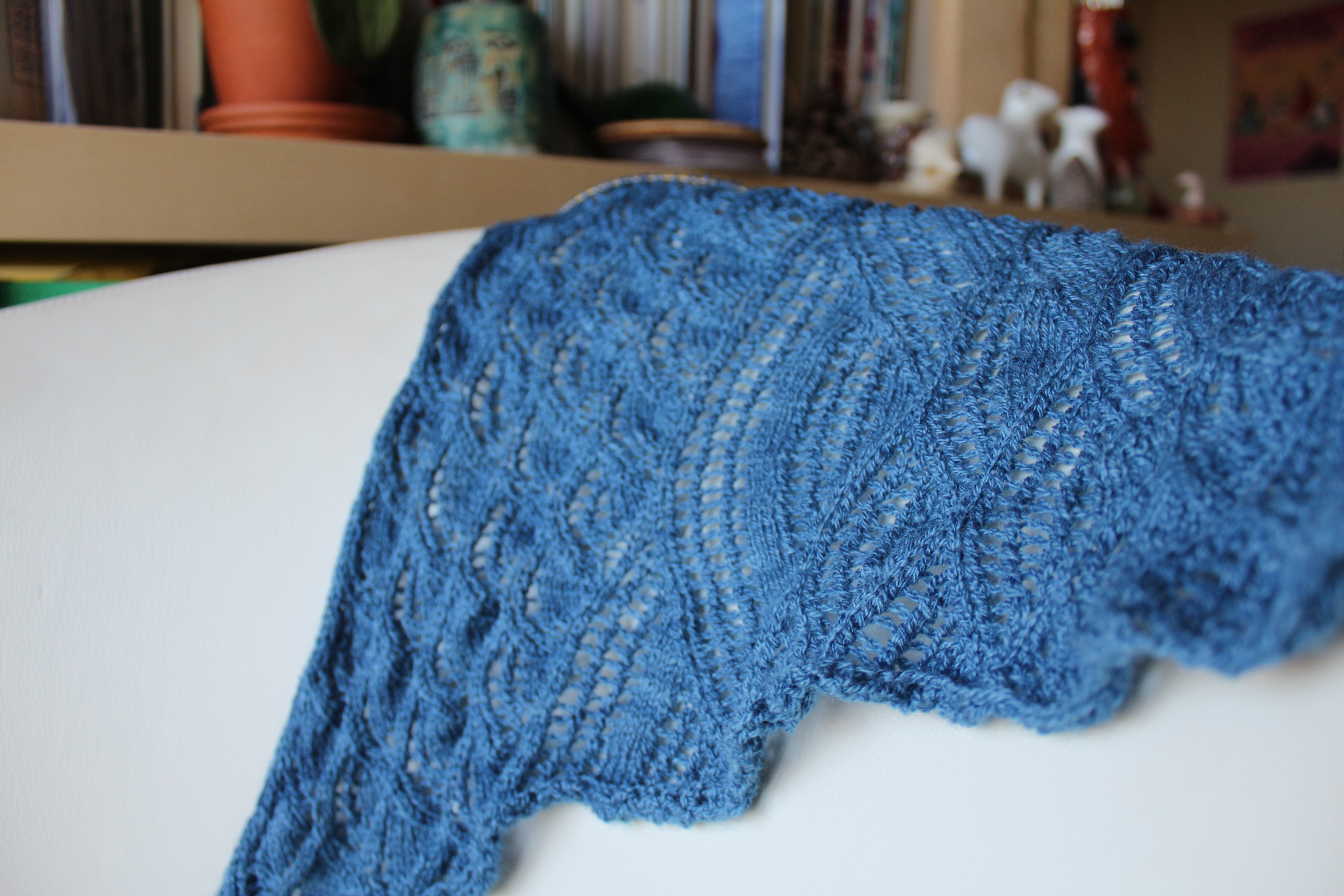 Needless to say, all my prior attempts to dig through all the mire to reach the happy bits underneath failed. So let’s be quick here, before I start thinking about weddings too much. The shawl is actually a stole, High Seas from Kieran Foley. In the spirit of Knit American, I am knitting it with Swans Island Fingering, which is spun and dyed in Maine.