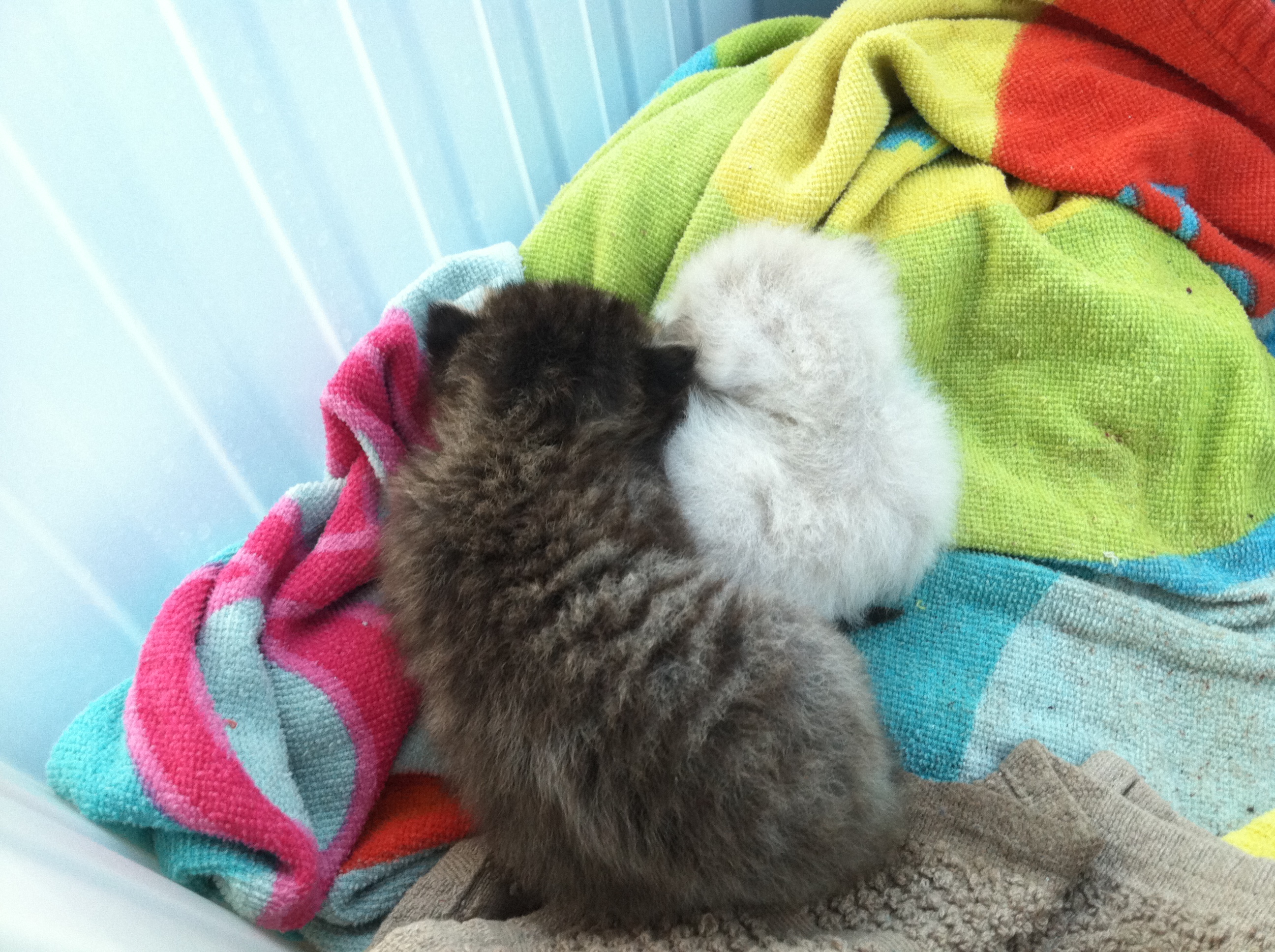 That thought lasted through the entire drive home, the hour and a half spent delousing them and bathing them with foaming Dawn dish soap, and their first feeding (kitten formula stinks to high heaven). The kittens are saved! briefly resurrected itself as I put them to bed in a fresh nest of clean towels, but that is definitely not what I was thinking when I had to wake up at two in the morning to feed them again.