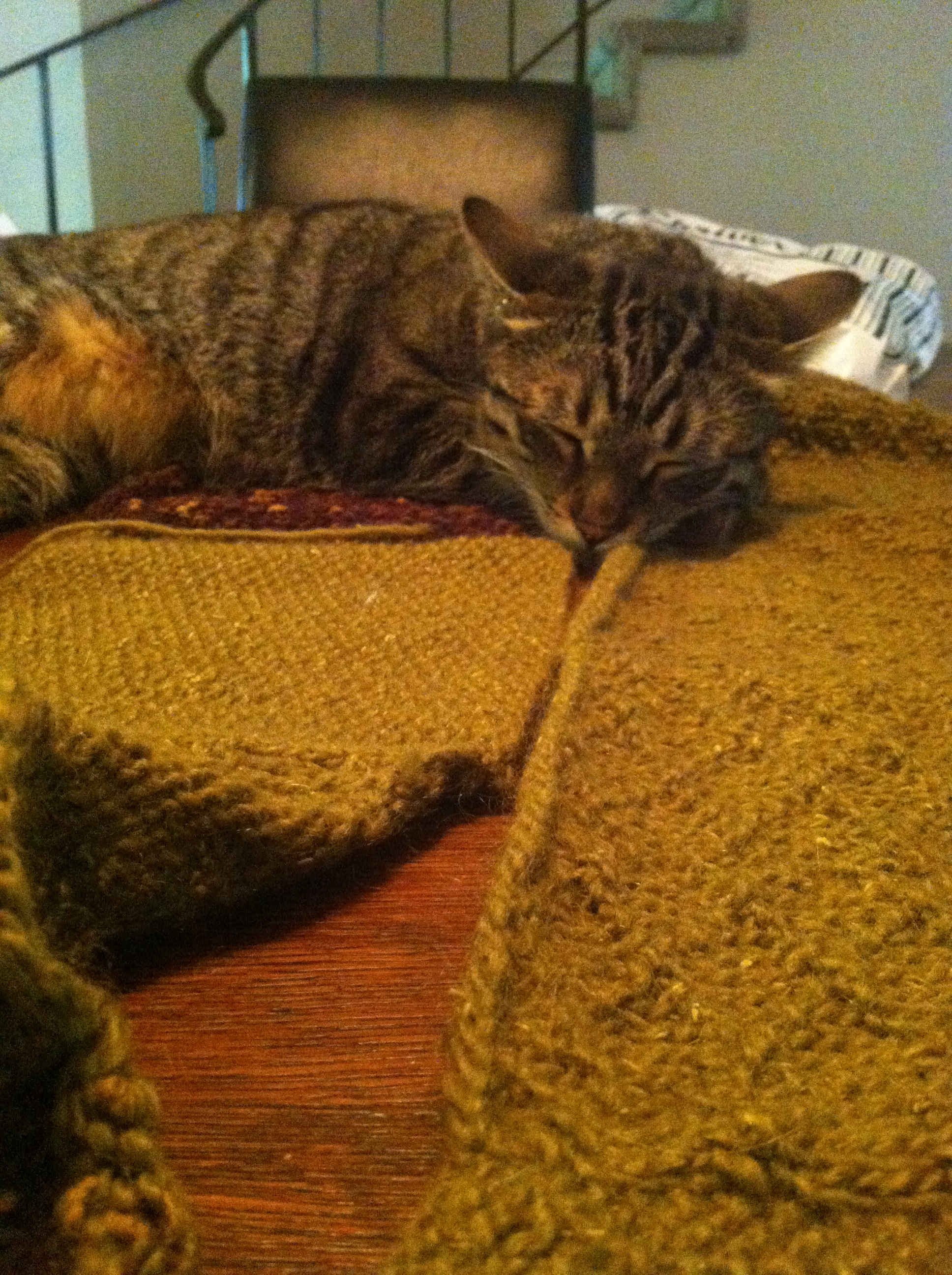 Fast-forward though much time spent chasing away kittens, mattress-stitching boring seams on different-sized squares, and a weekend of crocheting.