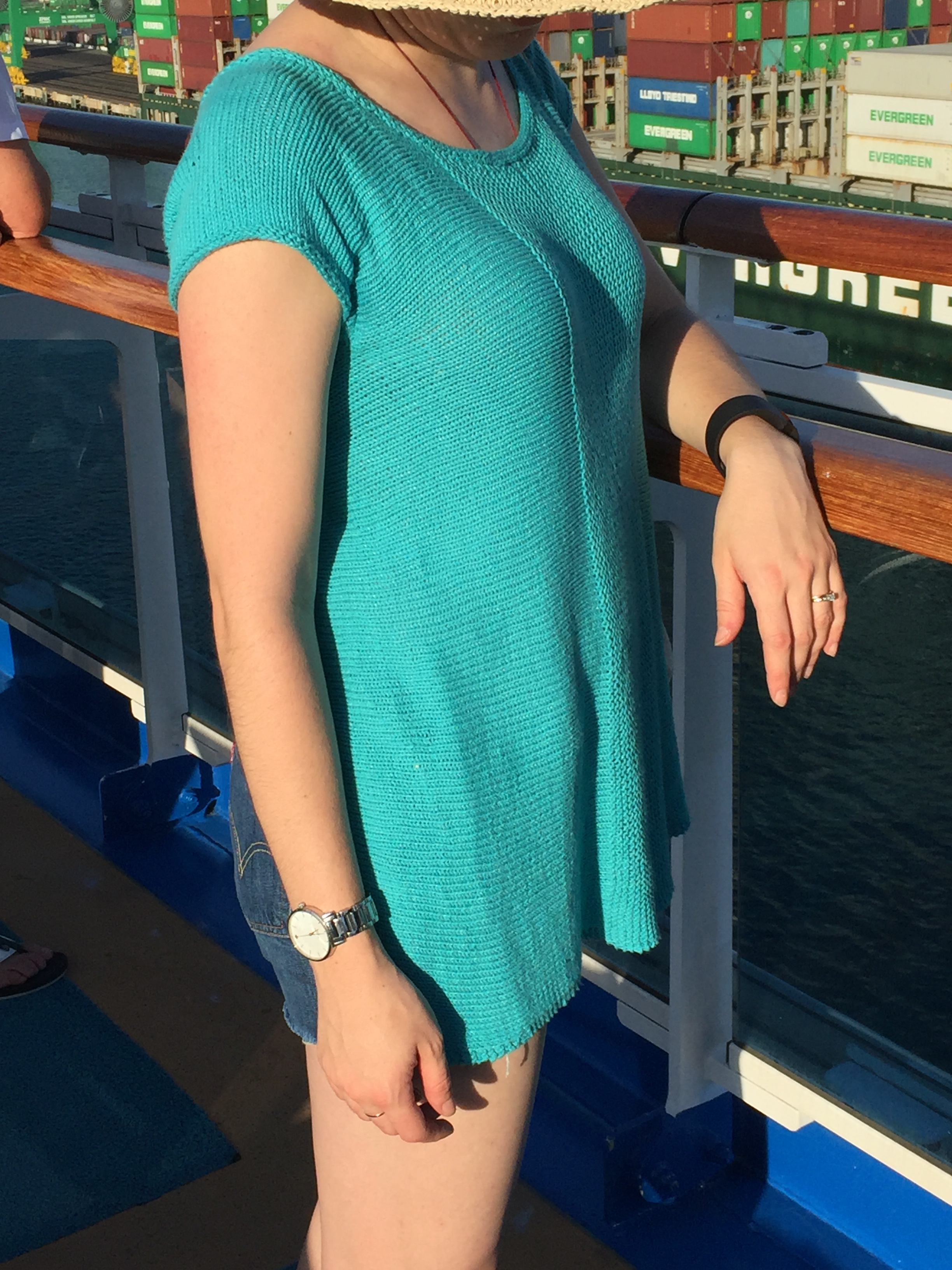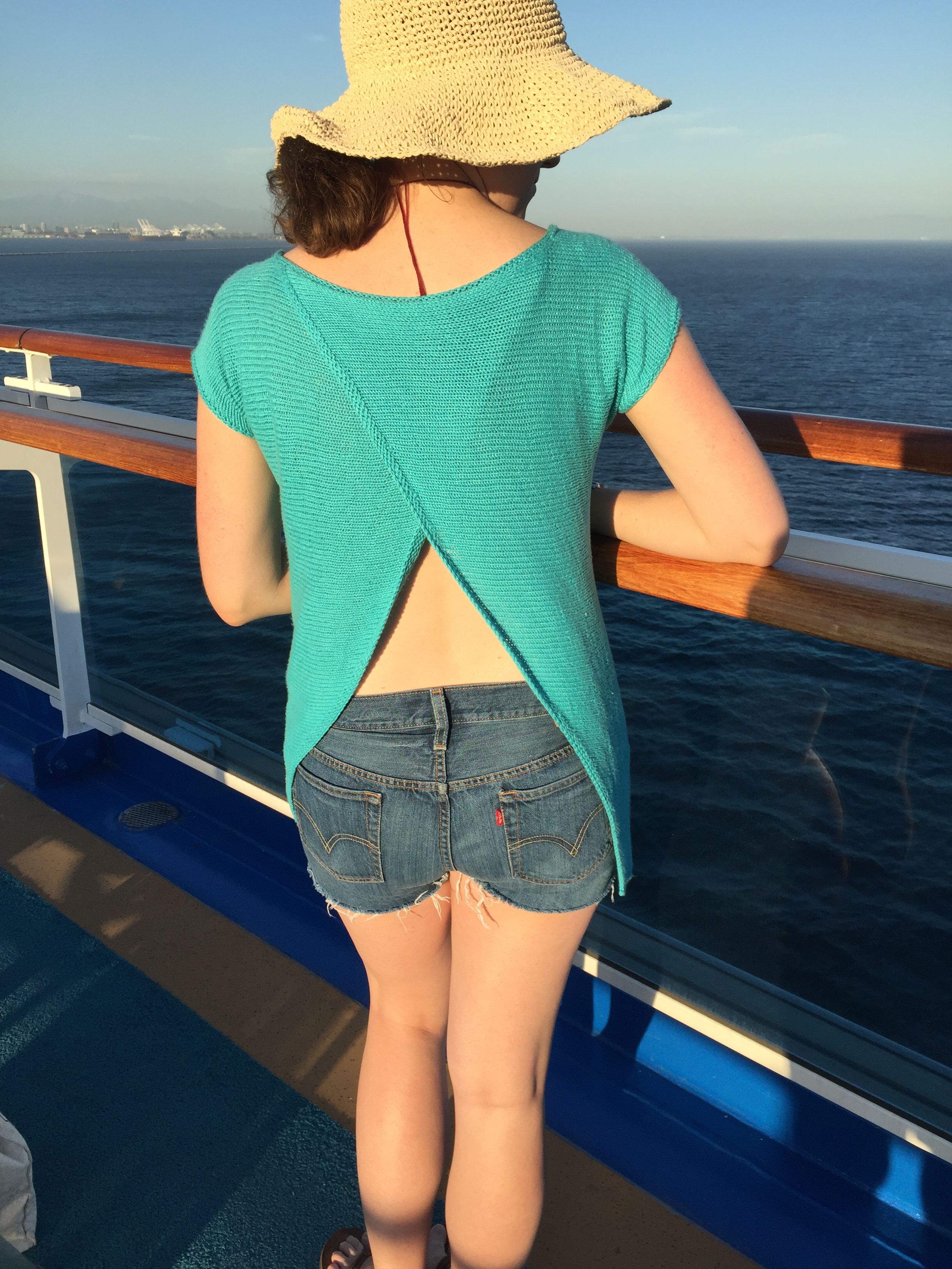 Front view of a woman wearing an open-backed sweater on a boat