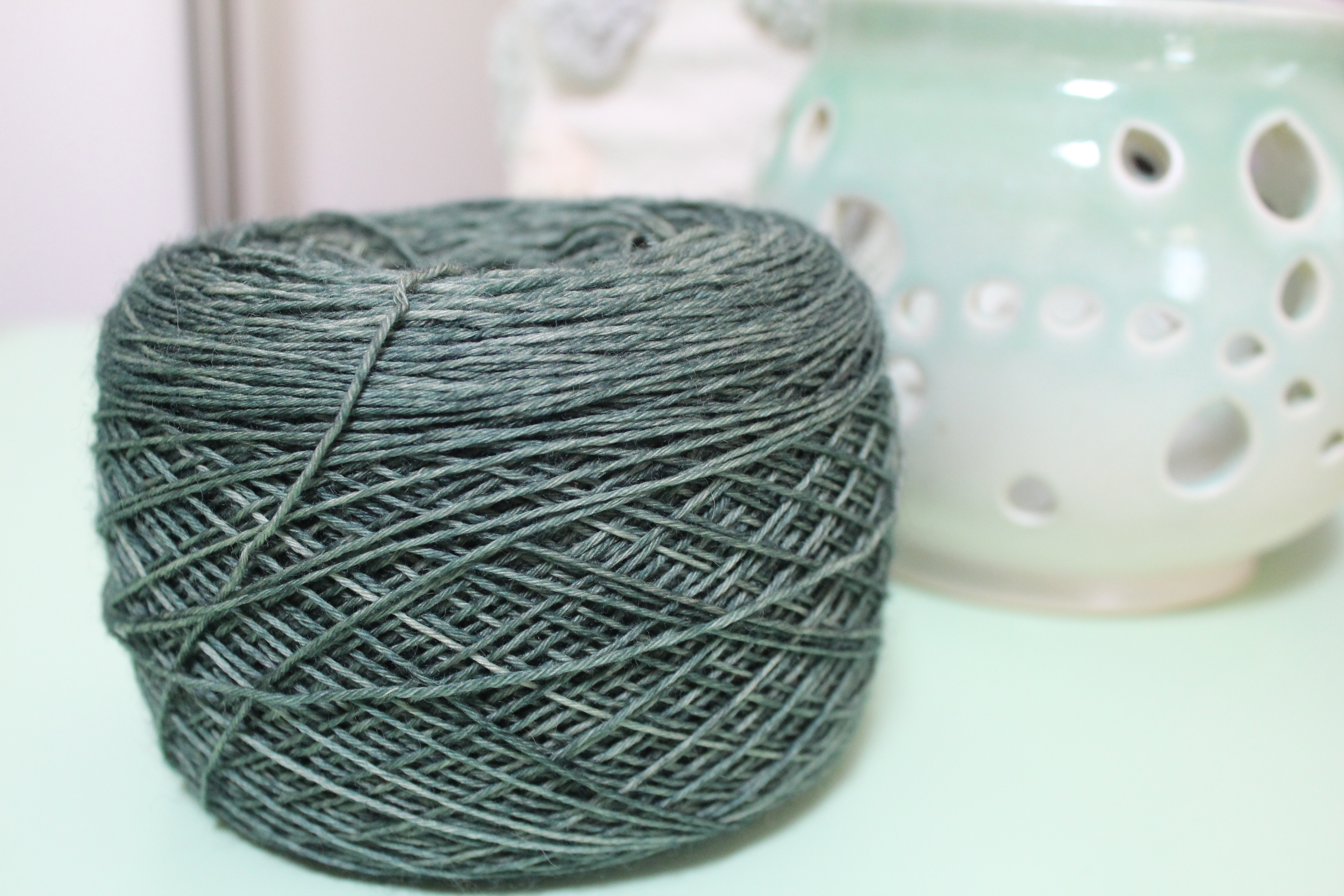 Cake of blue-green yarn dyed by Gherkin’s Bucket