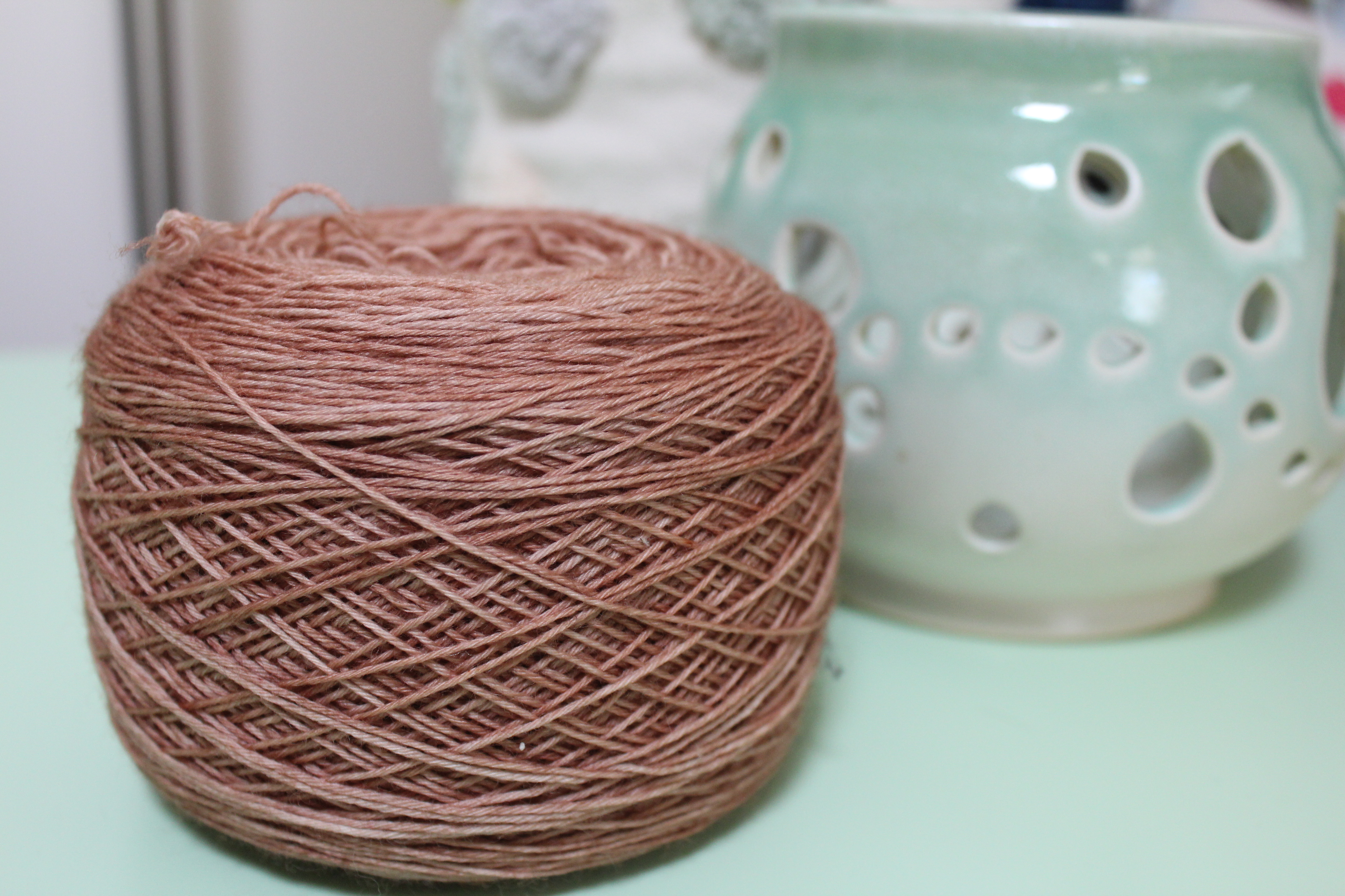 Cake of tan yarn dyed by Gherkin’s Bucket