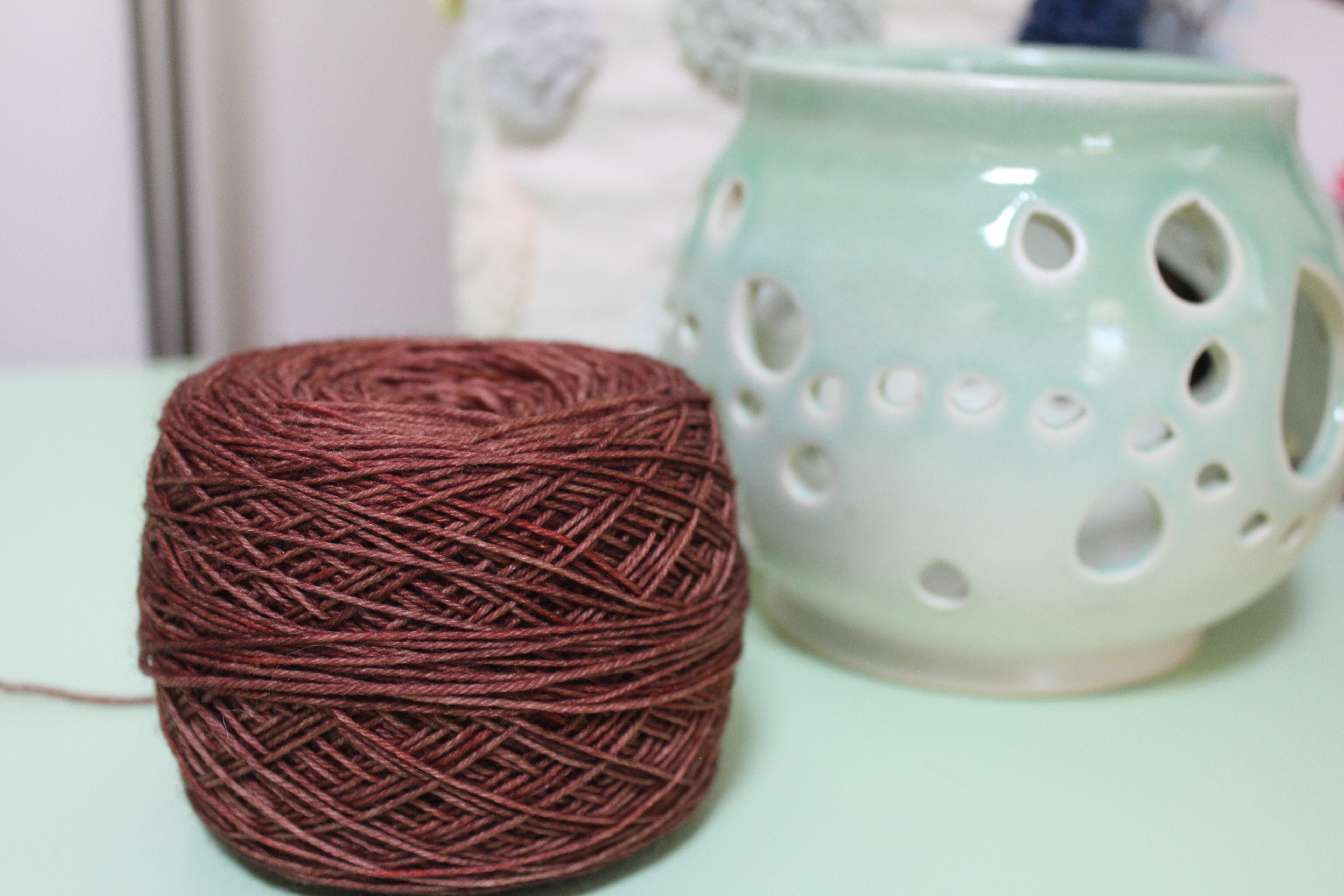 Cake of reddish-brown yarn dyed by Gherkin’s Bucket