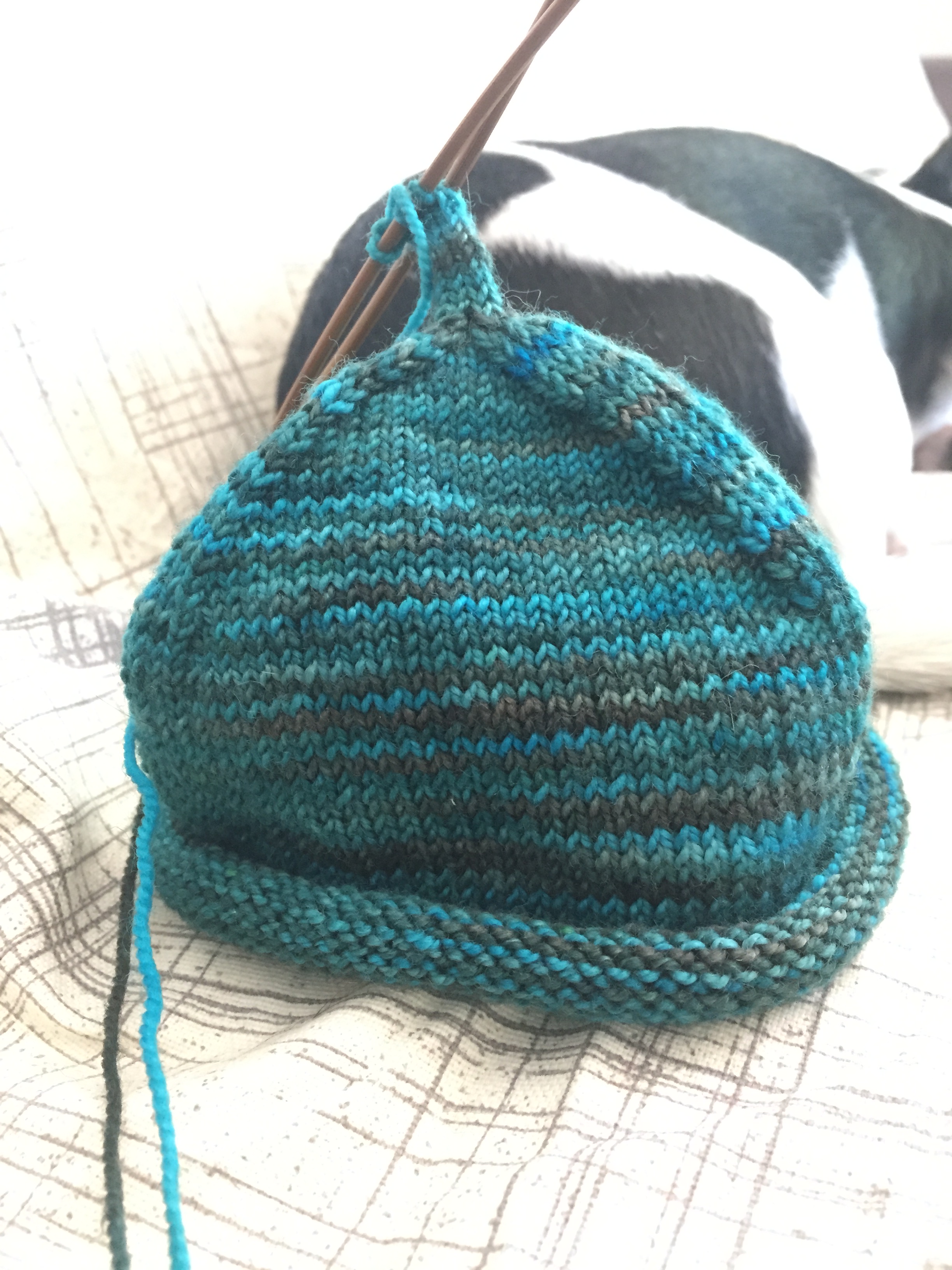Little Sprout Baby Hat knit in Yarns of Rhichard Devreize Peppino in the variegated teal colorway Farther