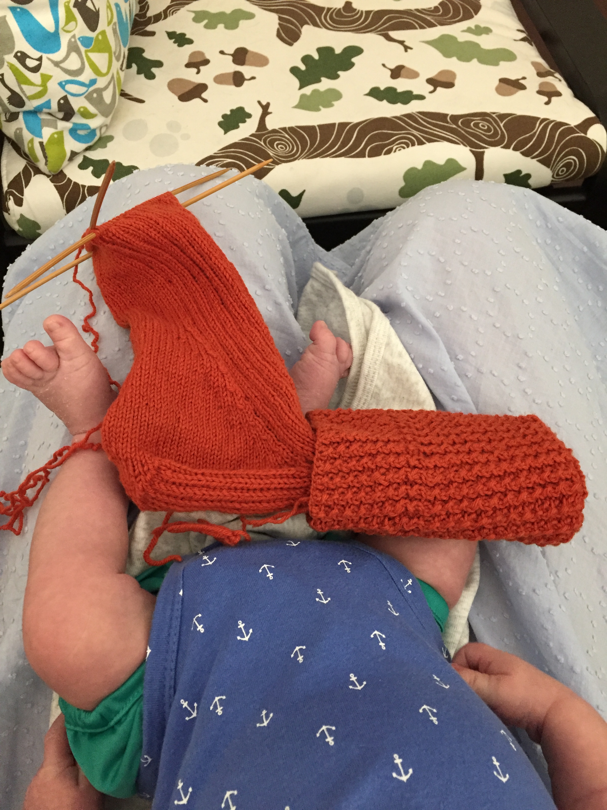 Rick and Roll sock in orange Quince and Co Finch yarn with baby feet