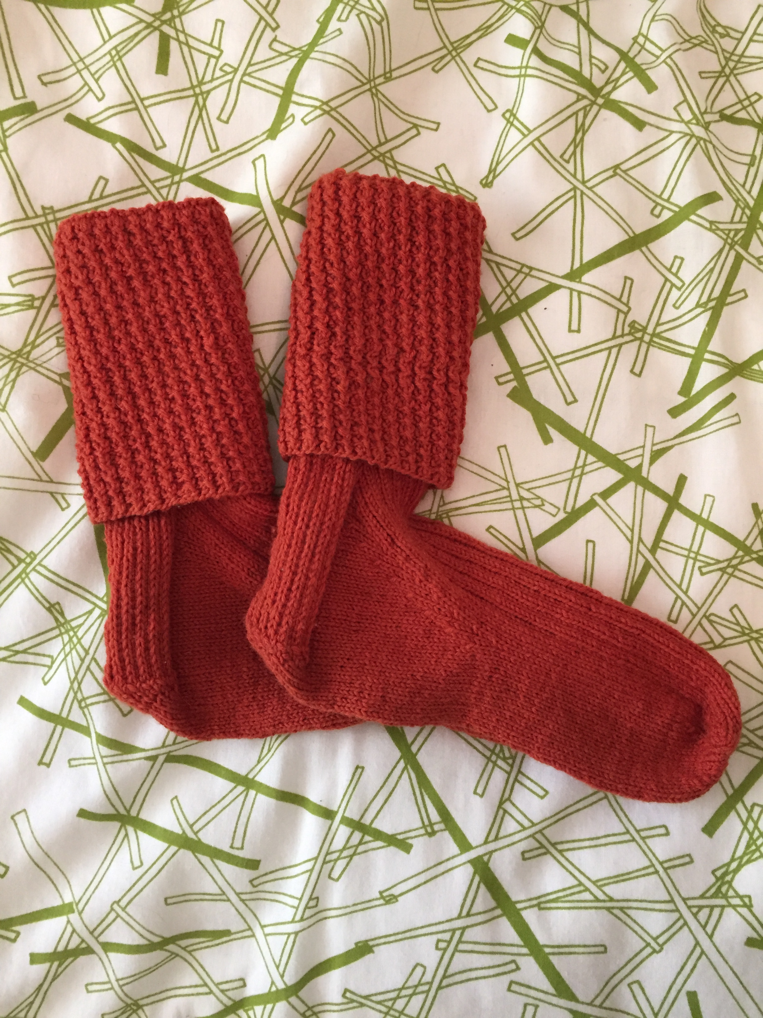 Finished Rick and Roll socks in orange Quince and Co Finch yarn
