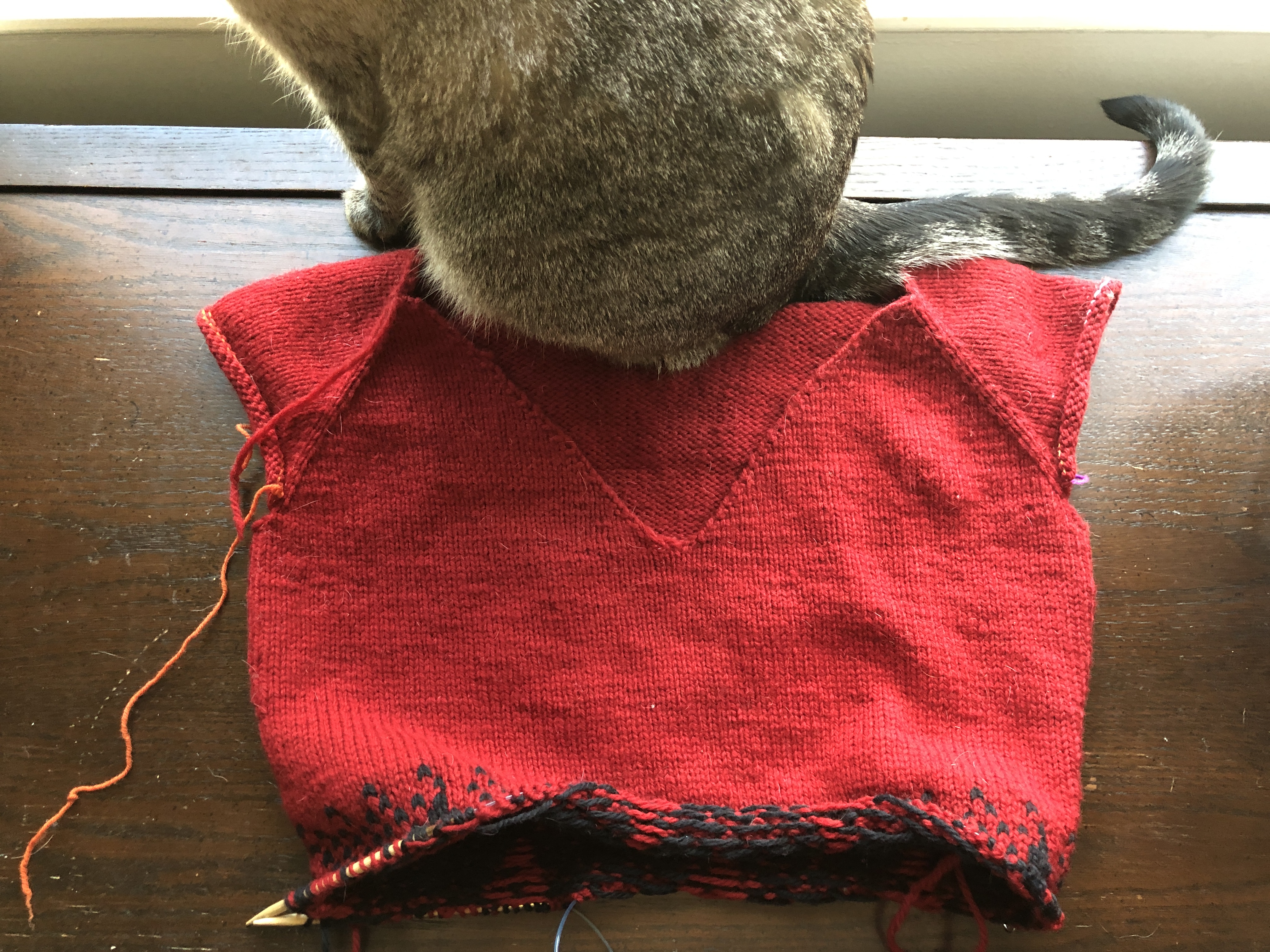 Red and black From Another Place pullover in progress with Eloise cat butt