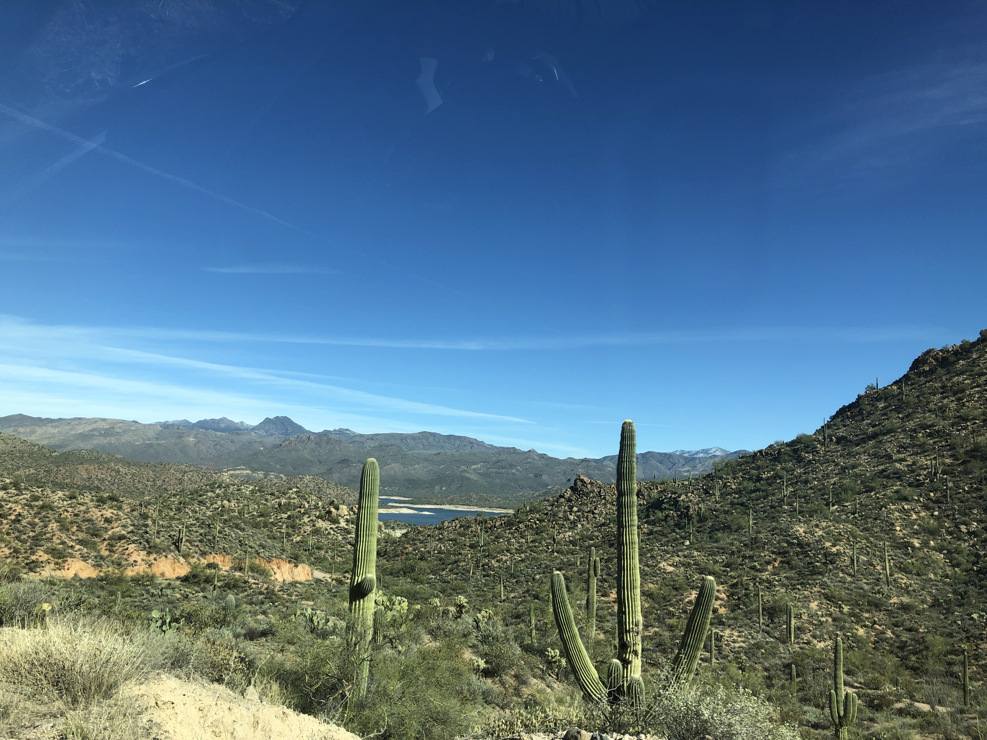 Bright blue sky above vibrant green Sonoran Desert plants, Bartlett Lake, and far away mountains
