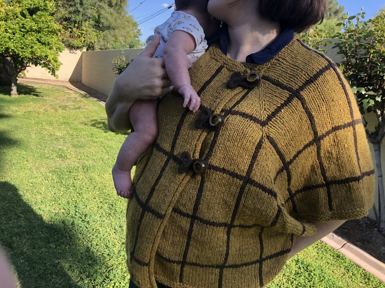 Perhaps related to my penchant for quick gift knits were the mixed successes of my two garment knits, the Plaidscape and Sothern sweater. I cast on the Plaidscape in a rush at the end of last year using yarn that had been frogged and not rewashed, and shocker, the gauge grew after blocking. I cast on a large and made some mods to add to the length, and it came out very big. I didn’t feel good wearing it while pregnant, and while there will enough room to stash Dollop in his carrier underneath next fall, I’m worried I won’t be able to style it I’m such a way I feel confident in it sans baby.