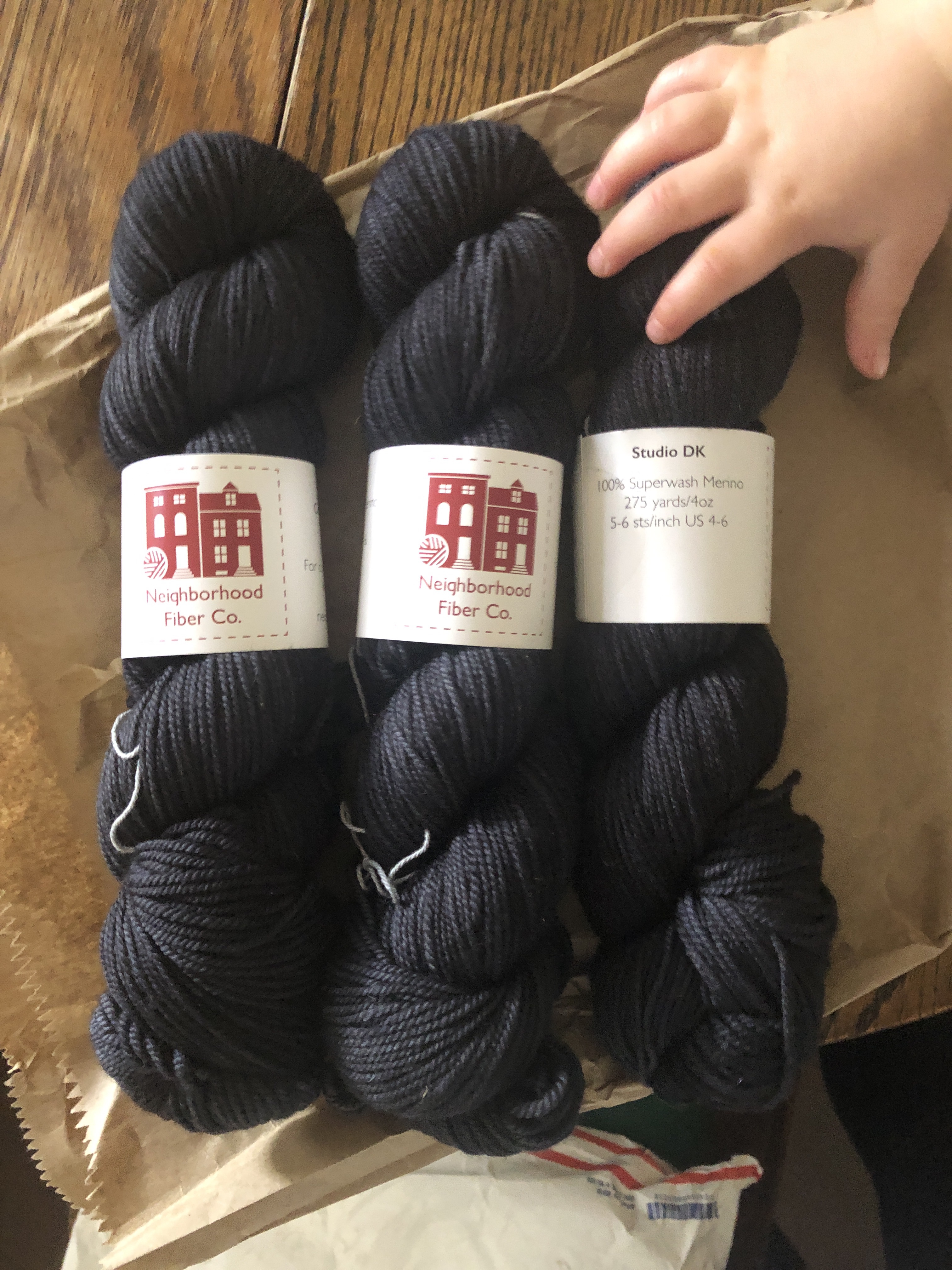 Neighborhood Fiber Co. Studio DK yarn in Upton black, with a baby hand reaching in to the frame