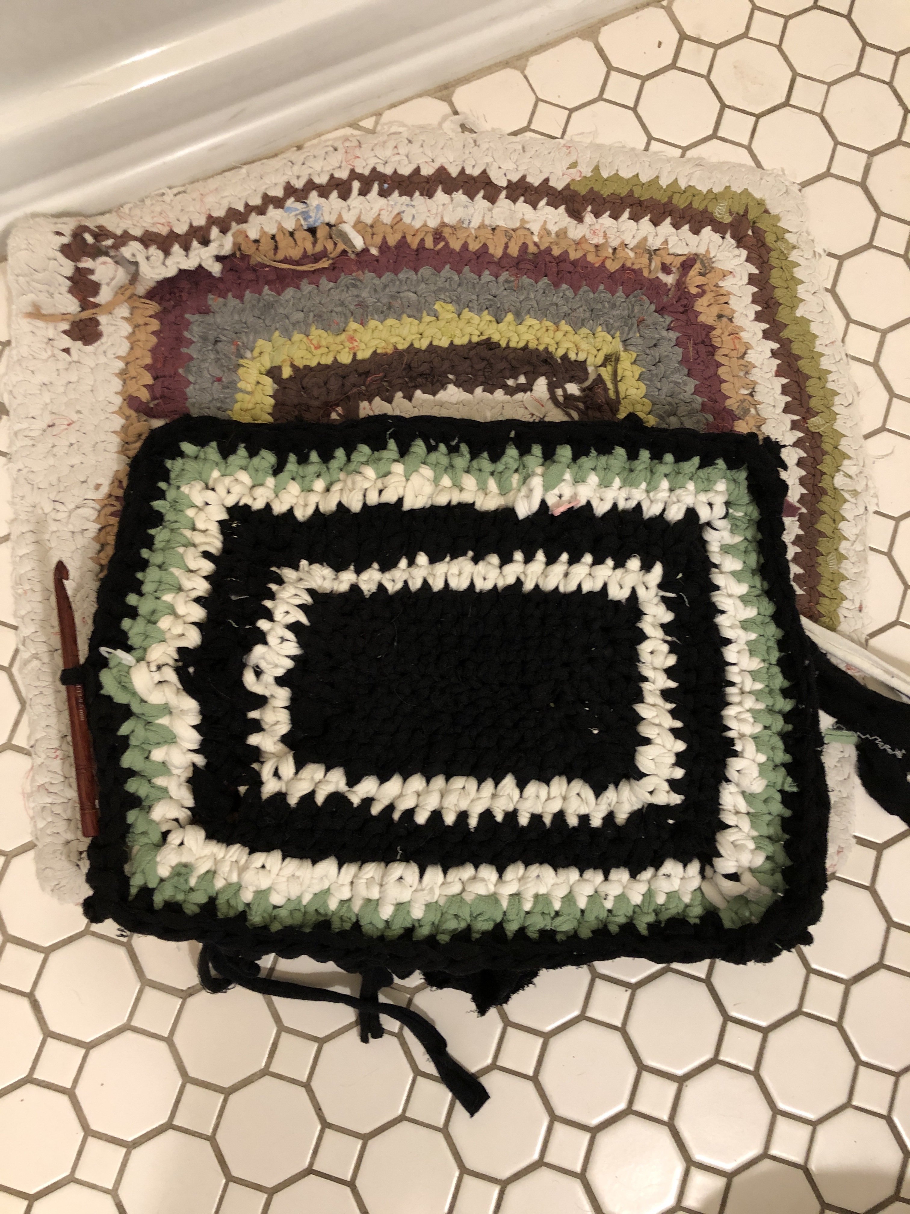 New bath mat crocheted out of recycled t-shirt fabric on top of old, ragged bath mat