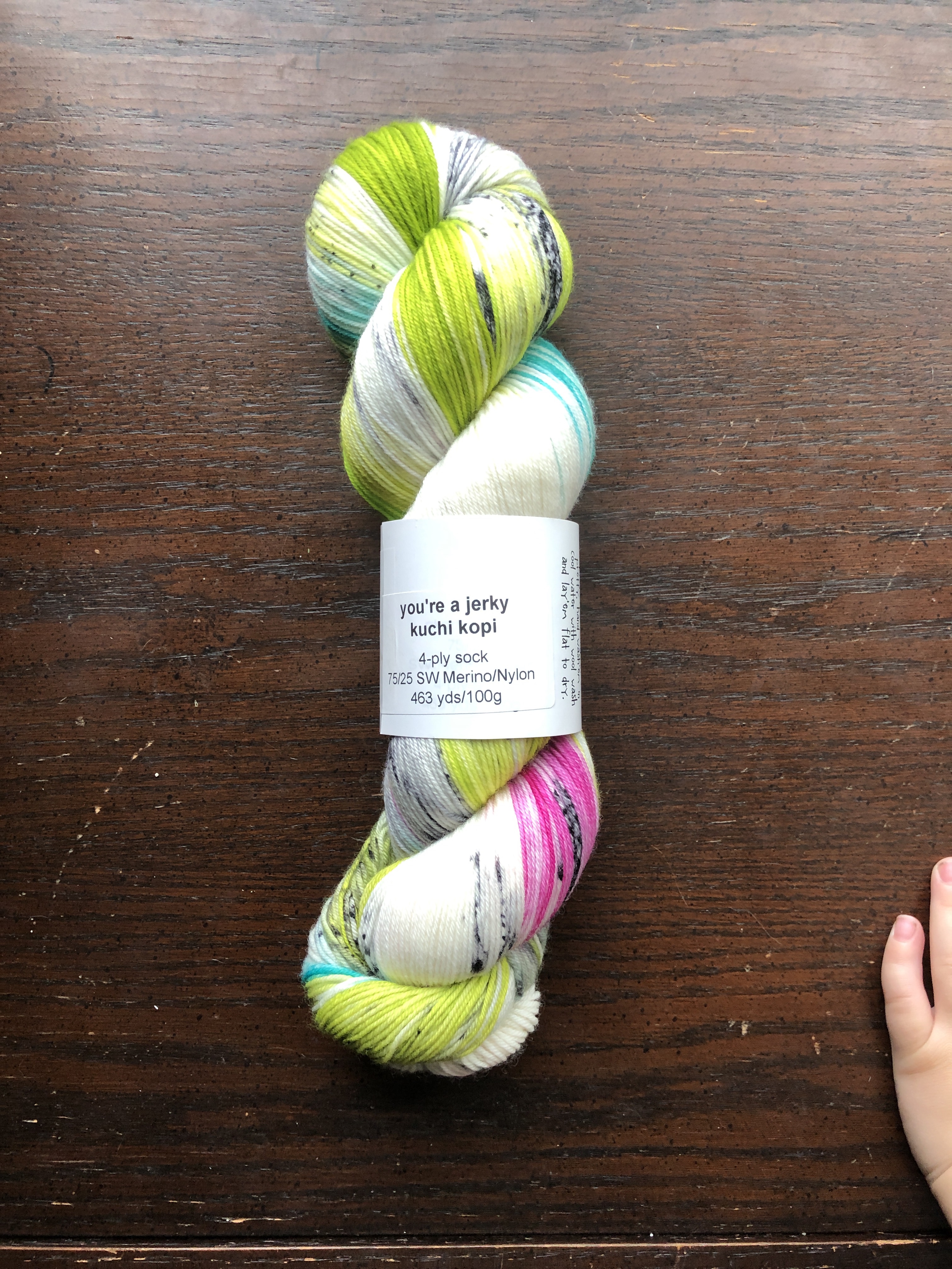 plank & stella Sock in You’re a Jerky Kuchi Kopi, a pink and green speckle, on a dark wood background