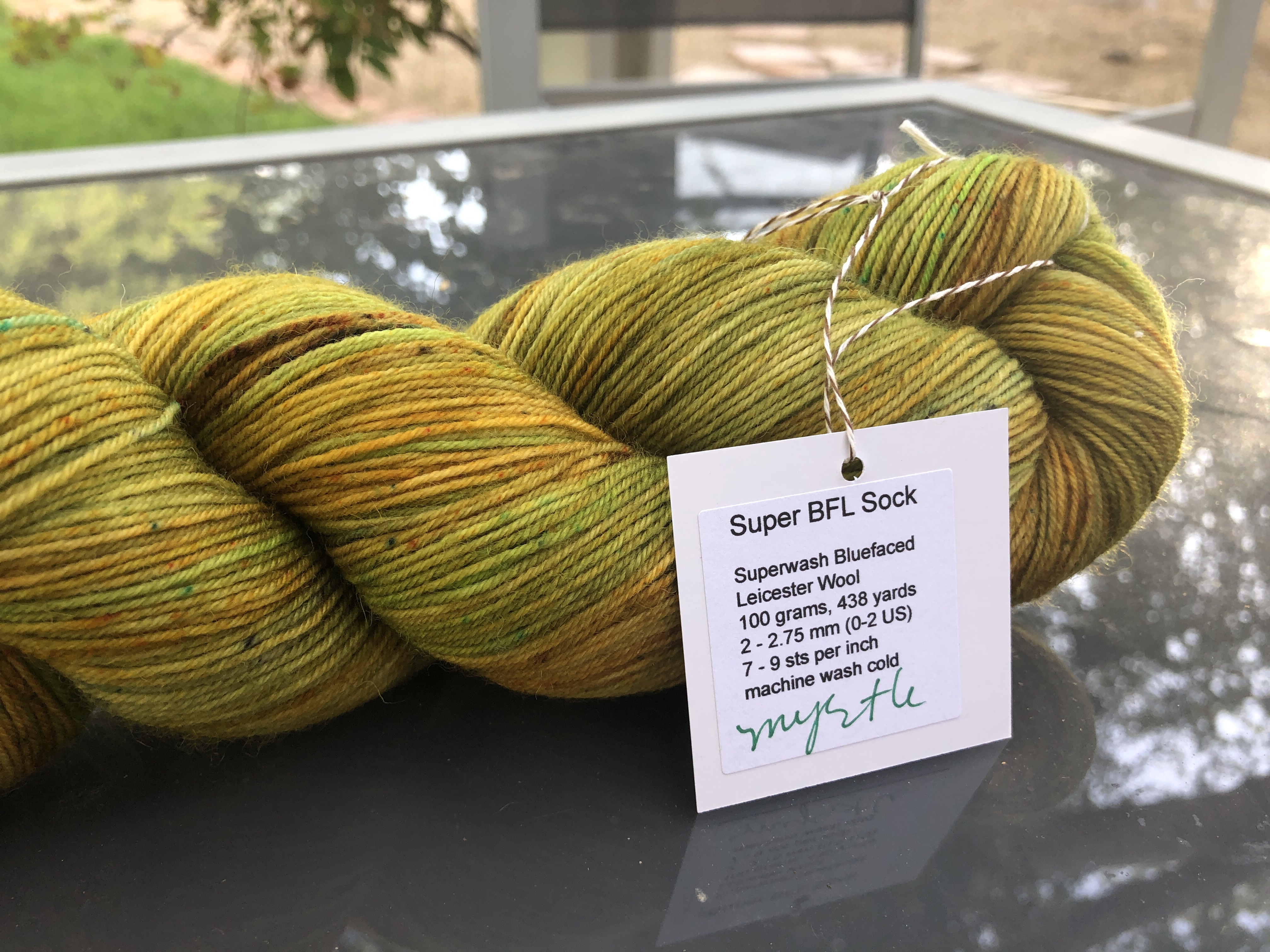 Hello Yarn Super BFL Sock in Myrtle, a yellowy green, on a glass table