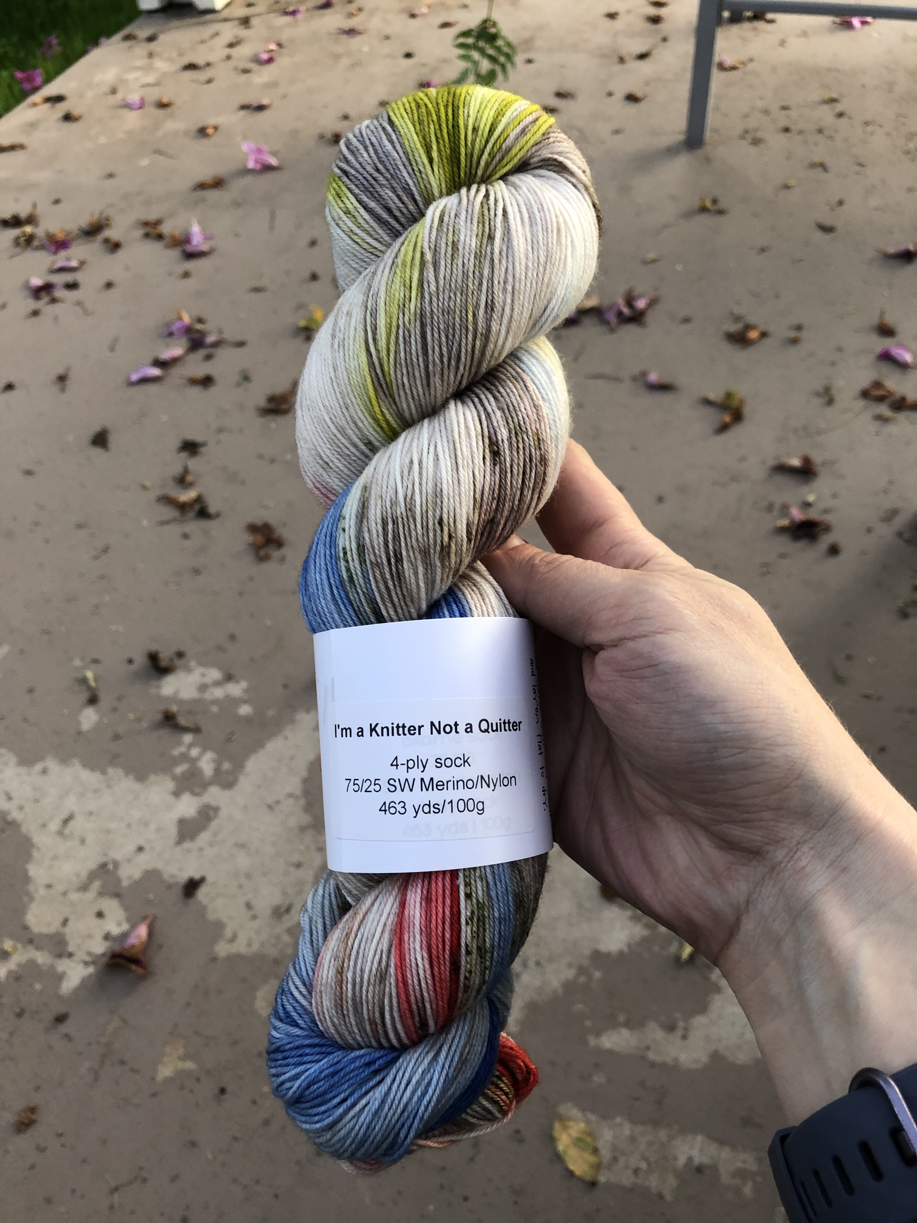 plank & stella 4-ply sock in Bob’s Burgers inspired colorway I’m a Knitter Not a Quitter against a leaf-strewn background